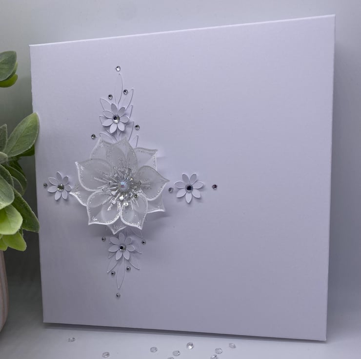 This card comes in a handmade box and is a traditional standing card with a lovely verse inside . The wording has been cut out of textured vinyl and the flowers are made from vellum and heat embossed with embossing powders then formed and curled with silver stamen and a pearl for the centre.