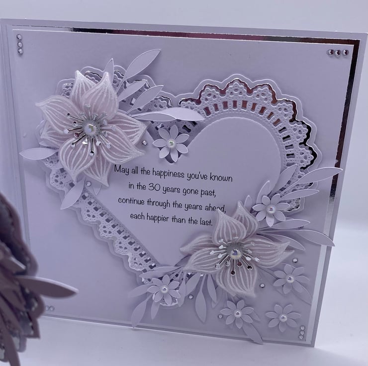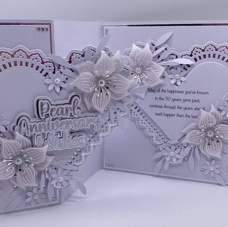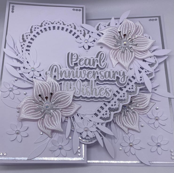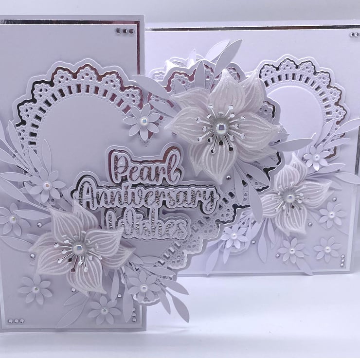 Both hearts have been die cut and layered up to give it the 3D look. You have the choice of adding names to the card, and there is a section where you can do this (at no extra cost) they will also be silver and white. The wording for the front 'Pearl Anniversary Wishes' comes in two similar fonts (style of writing) but with all my makes, you will always get the best quality and make each time.