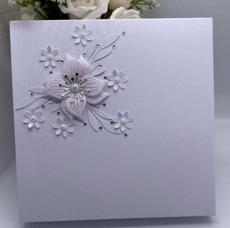 As standard every card is presented in a handmade box but this one has been decorated with flowers that match the card inside, there is a complimentary organza pouch containing confetti. Tissue paper lines the box along with a ribbon. These boxed cards make a lovely keepsake