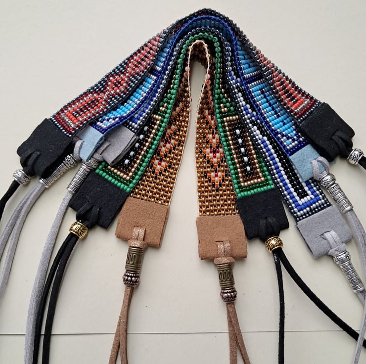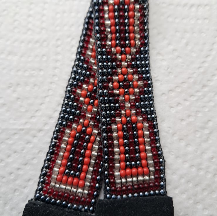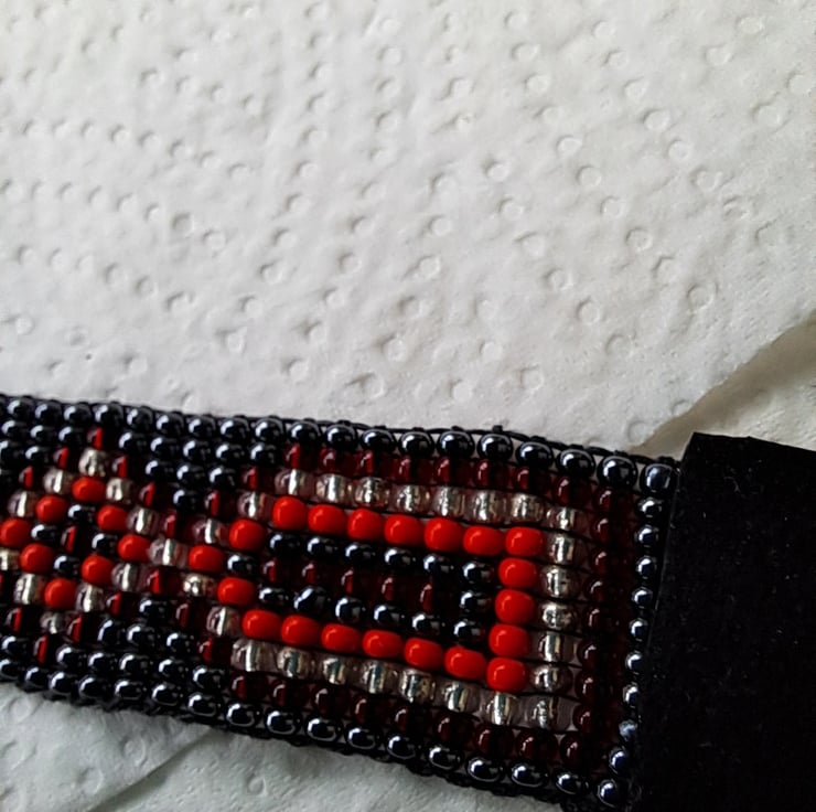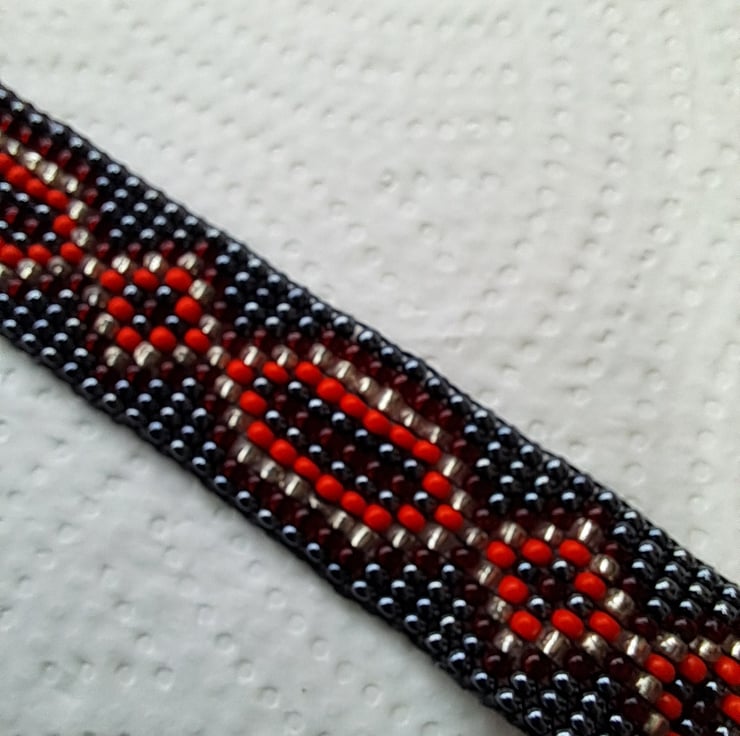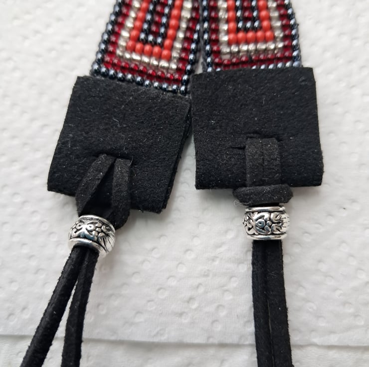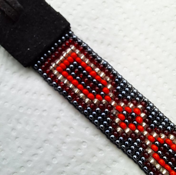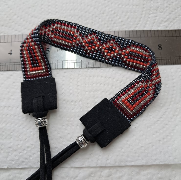 Beadloom bracelet or anklet length 8". Can be worn as a bracelet/anklet with long suede ties to fit most sizes. Made with seed beads in Gunmetal, red,and silver with Black Suede ties. With Tibeten silver ending bead. Completely handcrafted. Unisex. Something for a change this Summer. Thankyou for looking. Lori
