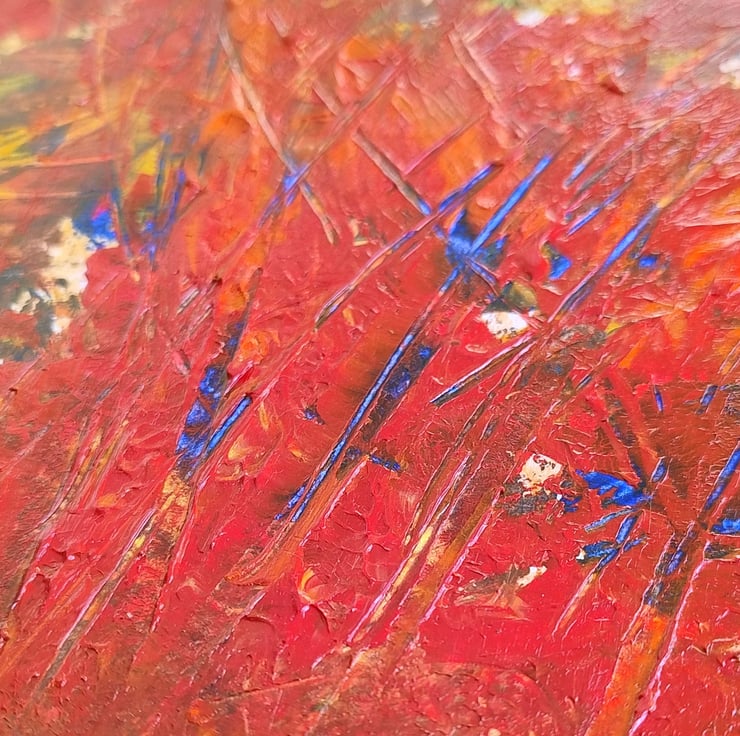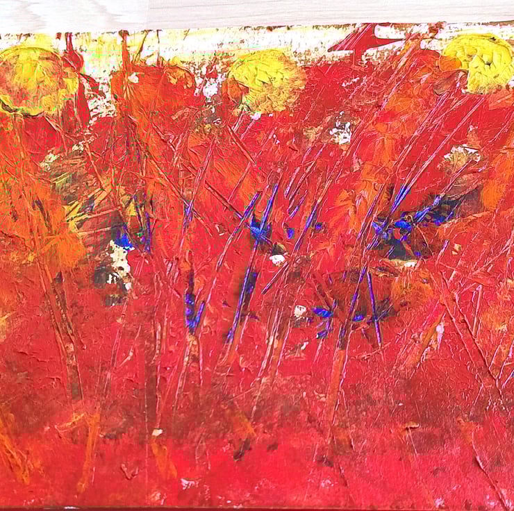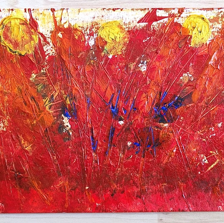 Experience the warmth of a summer evening with this vibrant original mixed media painting. Dominated by deep crimson and fiery orange hues, this piece features bold, impasto-style textures that evoke tall grasses swaying in the light. Bright pops of yellow "sun-disks" or wildflowers ground the composition, while subtle streaks of electric blue add a modern, unexpected depth.