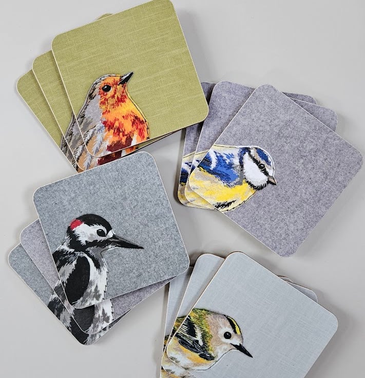 My designs are inspired by British wildlife. I create them using a combination of appliqué and freehand machine embroidery. The designs are then scanned and digitally printed on coasters, placemats, tea towels, tote bags and greetings cards, and are all listed on my Folksy shop.