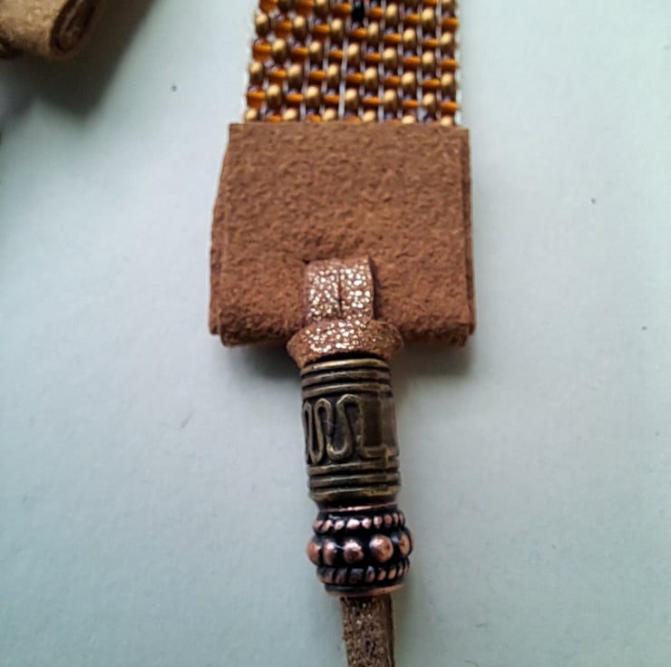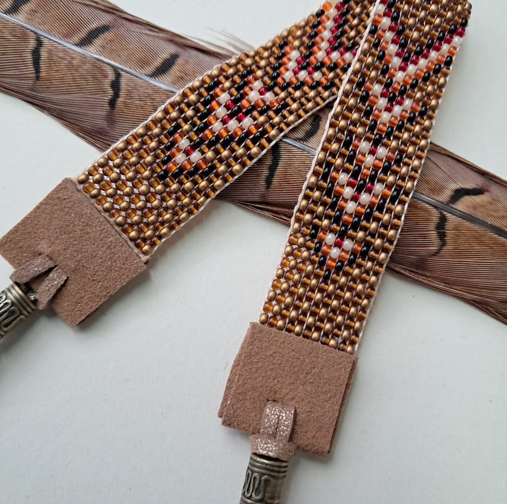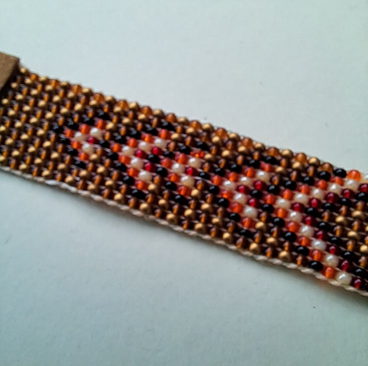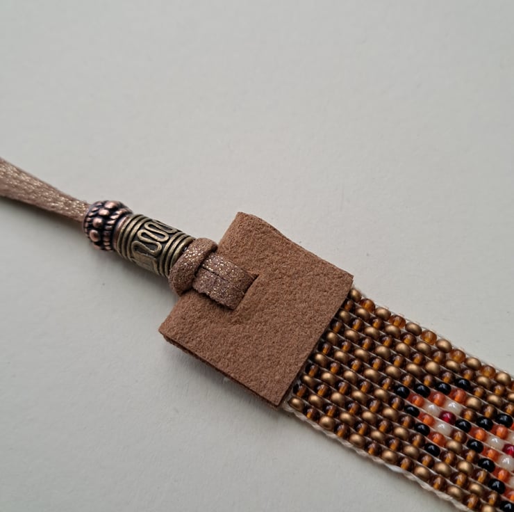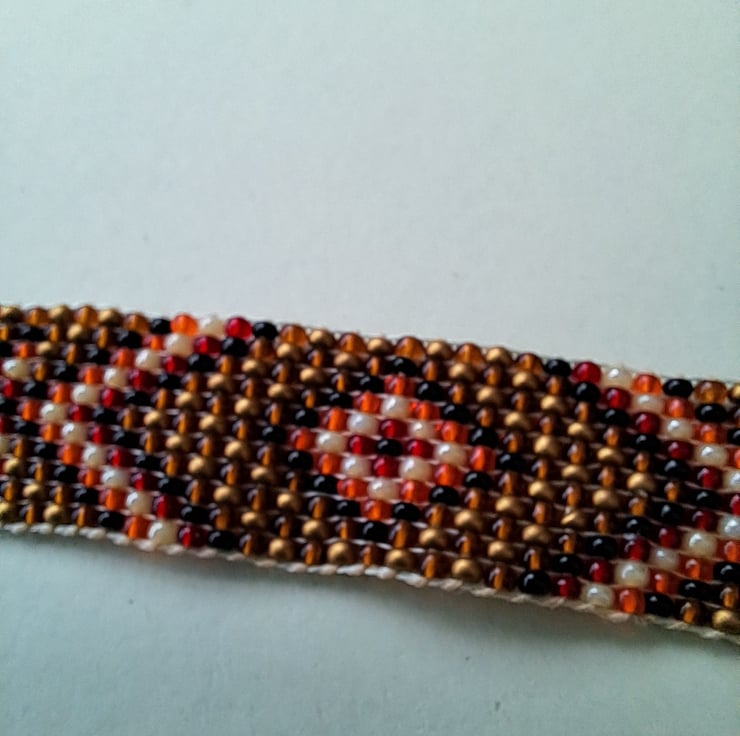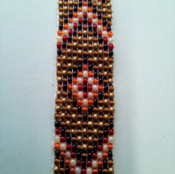 Beadloom bracelet/Anklet. Length 8" can be worn as either with suede endings and glitzy gold leather ties.With bronze endings. Will fit most sizes. High quality seed beads in rustic bronze, black, orange, red and Pearl in a Chevron design. Totally handcrafted. Unisex. Thankyou for looking. Lori