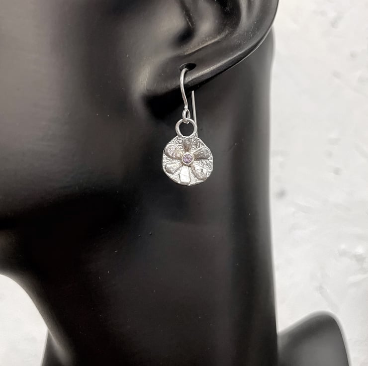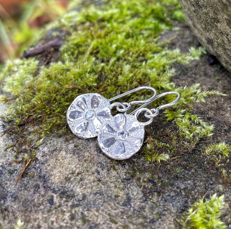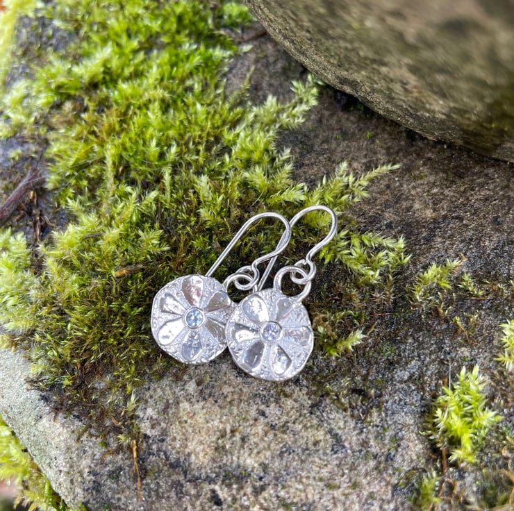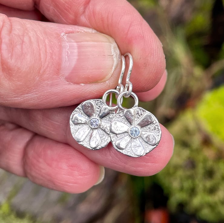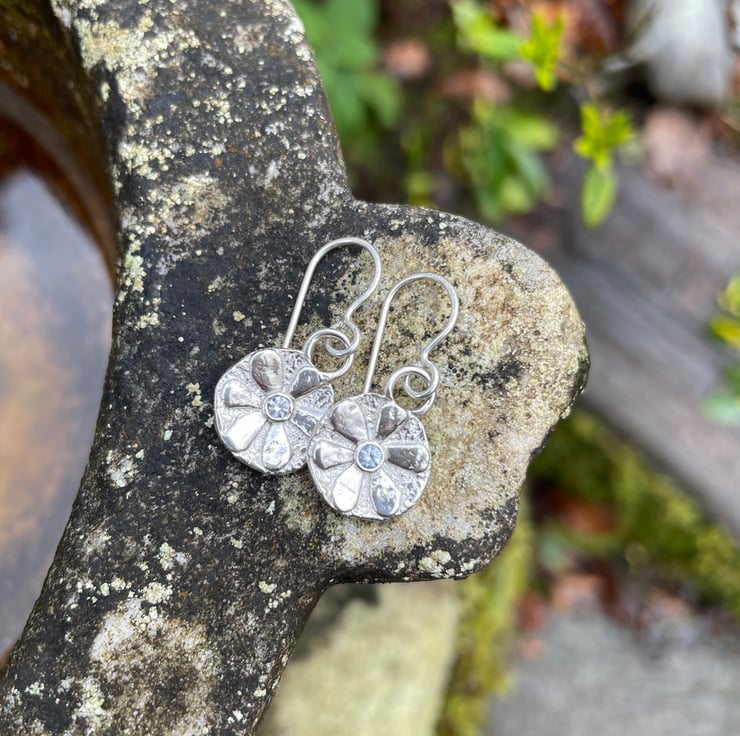 Small textured silver stylised flower earrings with pale blue sapphire centres.