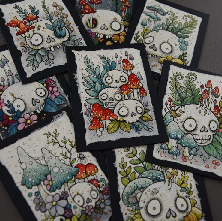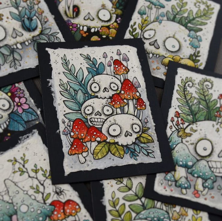 a sweet stack of smiling skulls, enjoying the spring vibes, surrounded by ferns and mushrooms.