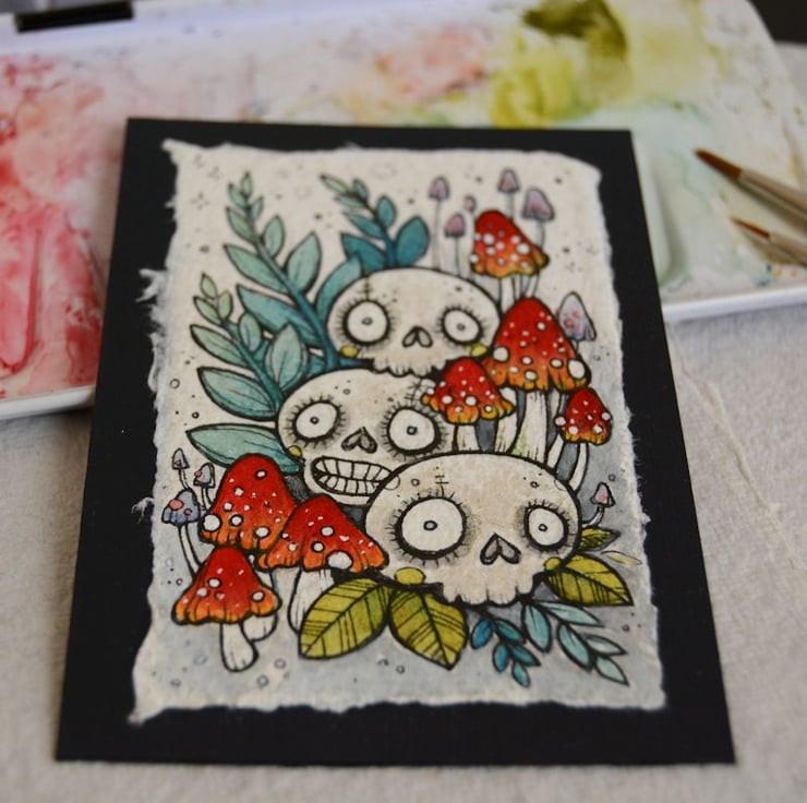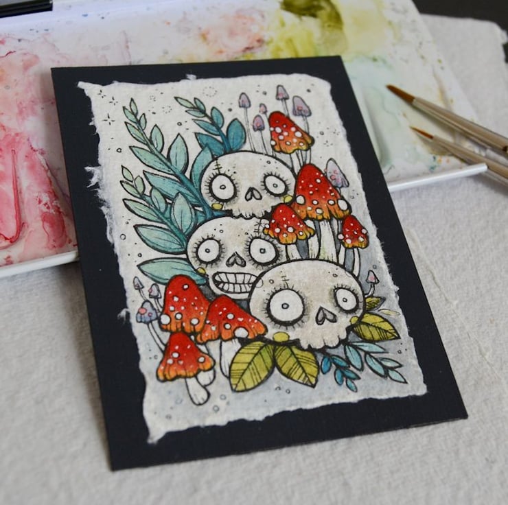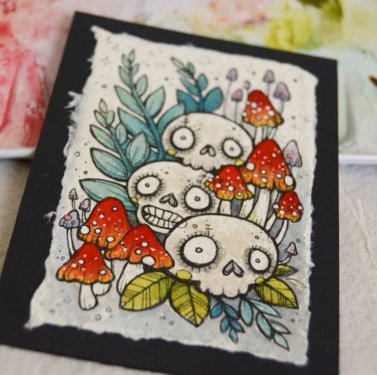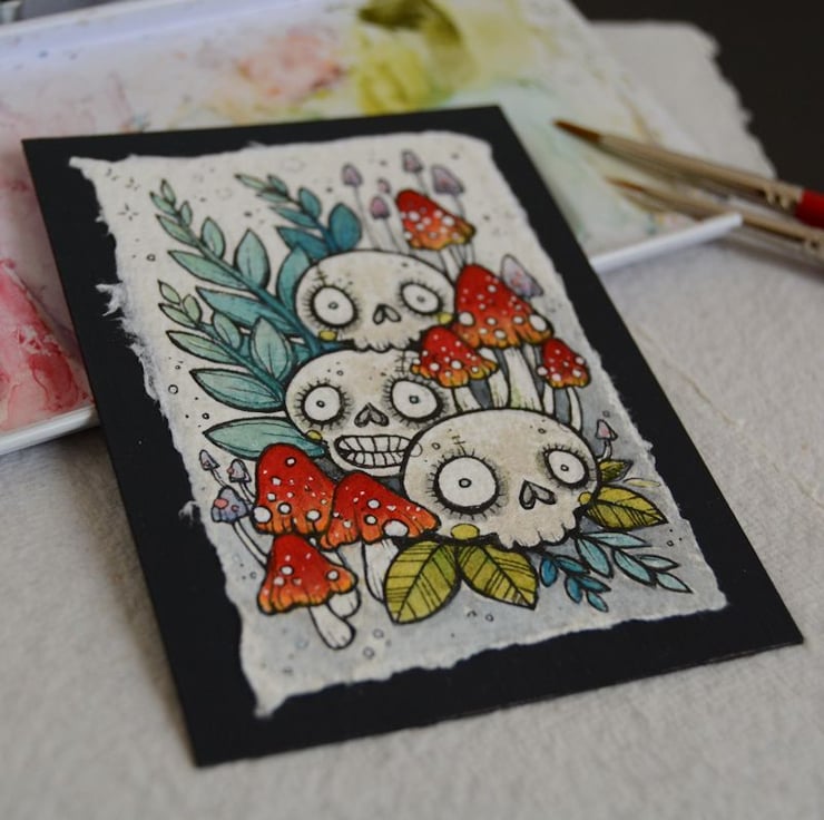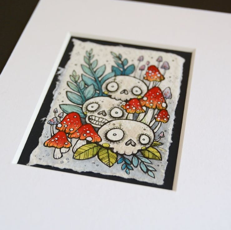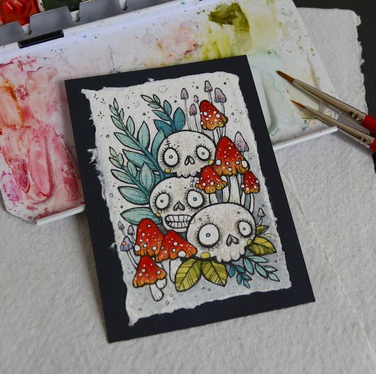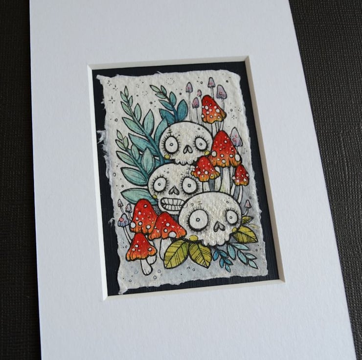 this aceo is an original artwork, hand drawn with a tiny 0.05 nibbed pen, then coloured with ink, artists pens and watercolour paints, on indian khadi paper. khadi paper is handmade from recycled cotton rag, it has a lovely textured surface and deckled edges. i have then mounted the illustration onto 300gsm cardstock, hand painted with a paynes grey to create a dark surrounding edge/background.