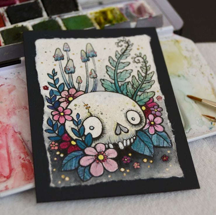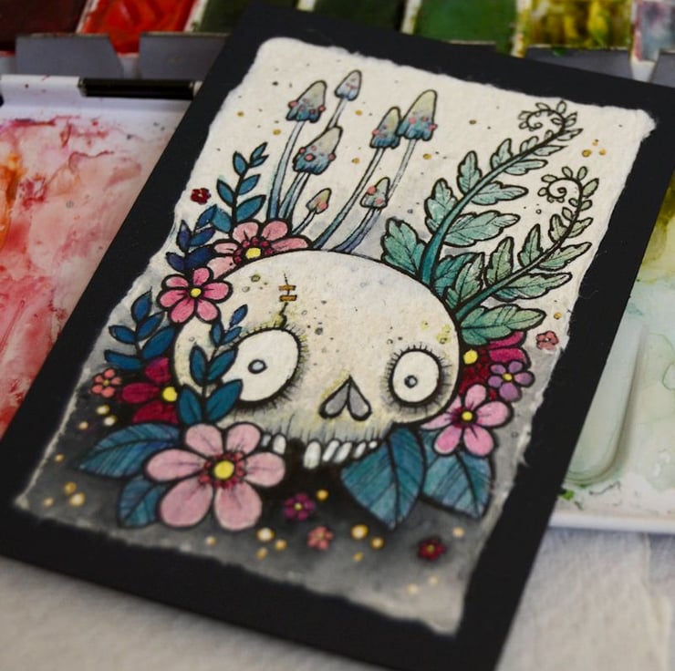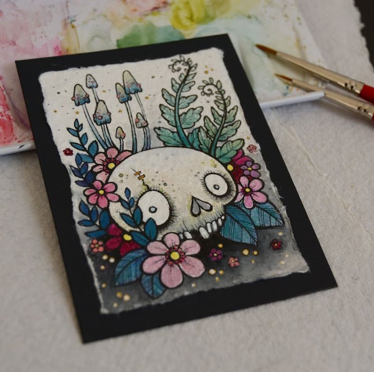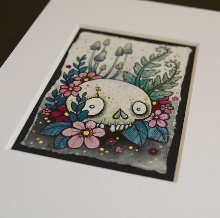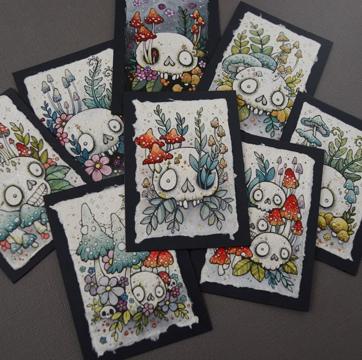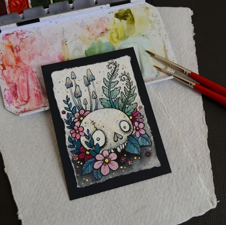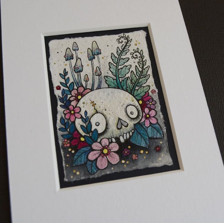 this aceo is an original artwork, hand drawn with a tiny 0.05 nibbed pen, then coloured with ink, artists pens and watercolour paints, on indian khadi paper. khadi paper is handmade from recycled cotton rag, it has a lovely textured surface and deckled edges. i have then mounted the illustration onto 300gsm cardstock, hand painted with a paynes grey to create a dark surrounding edge/background.