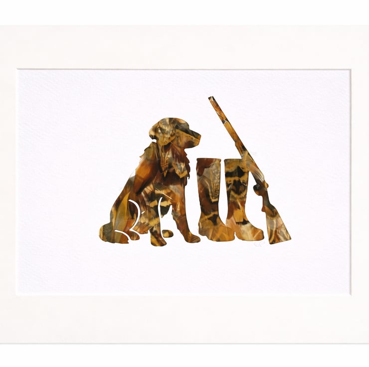 This handmade artwork celebrates the quiet moments of country life – a loyal gun dog waiting patiently beside wellies and a shotgun, ready for a day in the field.