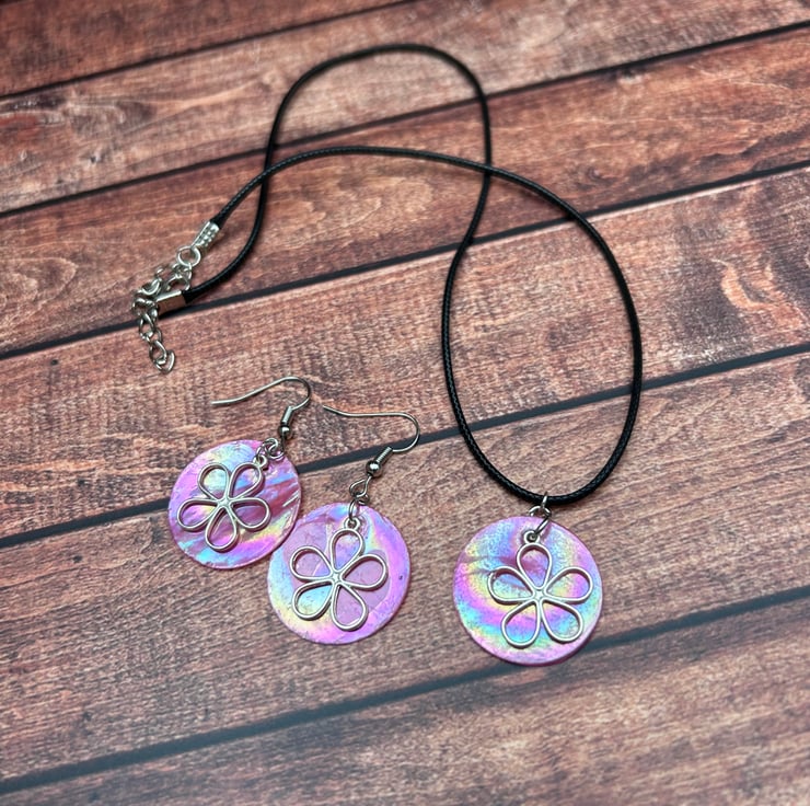 This charming jewellery set features a soft pink colour with delicate floral accents, perfect for adding a feminine touch to any outfit. The necklace includes a simple black cord with a pink circular shell, adorned with a silver-tone flower design for a clean, elegant look. The matching earrings mirror the necklace's design, offering a light and airy vibe with their own silver flower detail on pink circular shells. Ideal for those who appreciate minimalist, floral-inspired accessories, this set is perfect for everyday wear or a special gift.