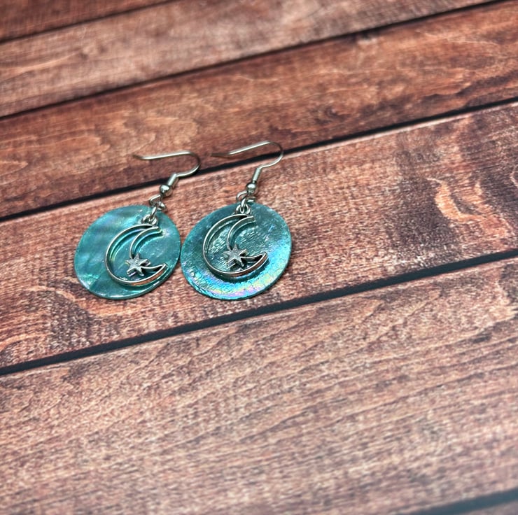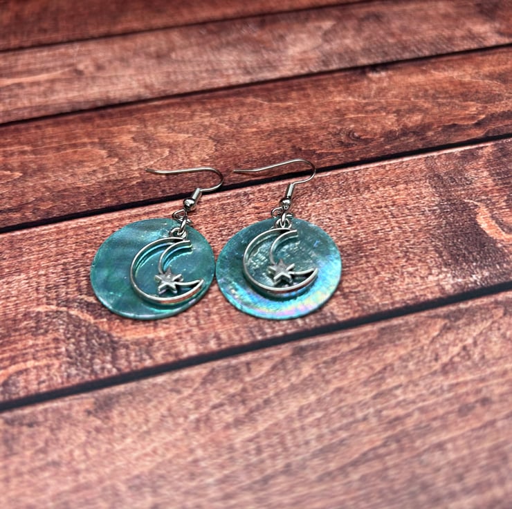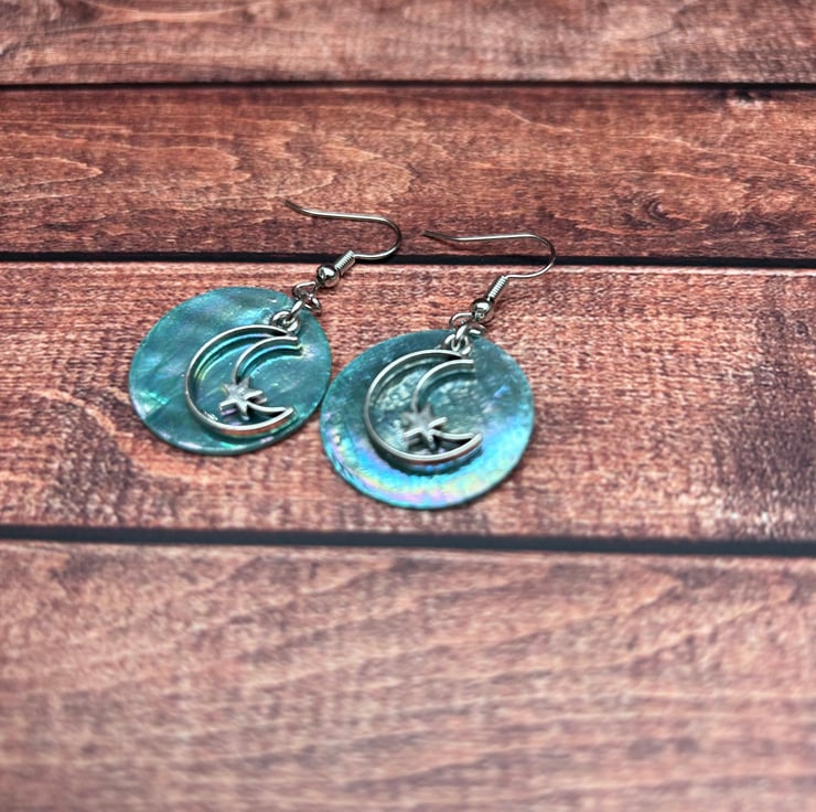 These enchanting earrings feature a celestial design with a crescent moon and a sparkling star. The moon and star charm are delicately suspended from iridescent turquoise abalone shell, which shimmer with shades of green, blue, and purple, reminiscent of a calm night sky. The silver-tone accents add a touch of elegance, making these earrings a perfect accessory for anyone who loves mystical and dreamy jewellery. Light and whimsical, these earrings are ideal for adding a touch of celestial magic to your everyday look.
