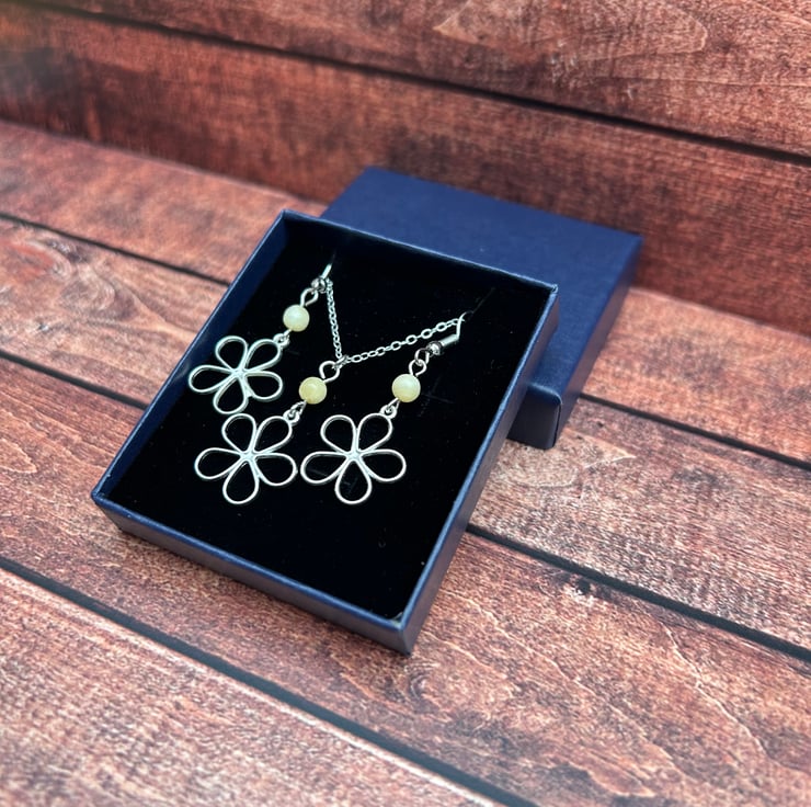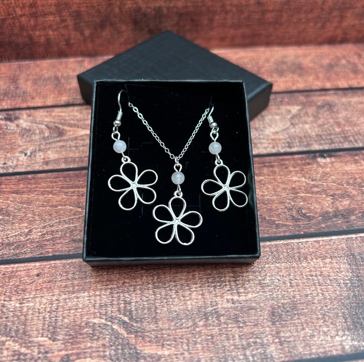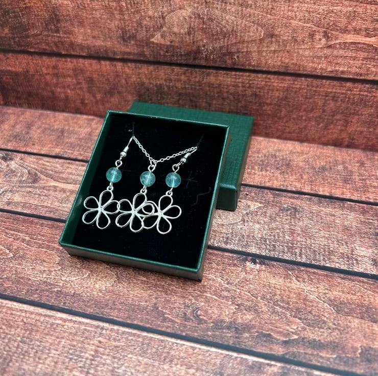 These elegant earrings feature a simple yet sophisticated design with silver-tone flower charms. Each earring is adorned with your choice of stone, creating a delicate and fresh look. The flowers are thoughtfully connected by a fine silver chain, adding a touch of movement to the piece. Presented in a stylish gift box, these earrings make a perfect gift or a lovely accessory for any occasion. Their soft colour and timeless floral design offer a charming balance of elegance and nature-inspired beauty.