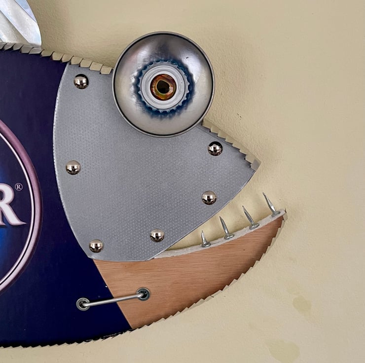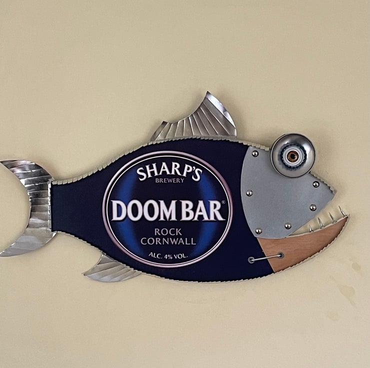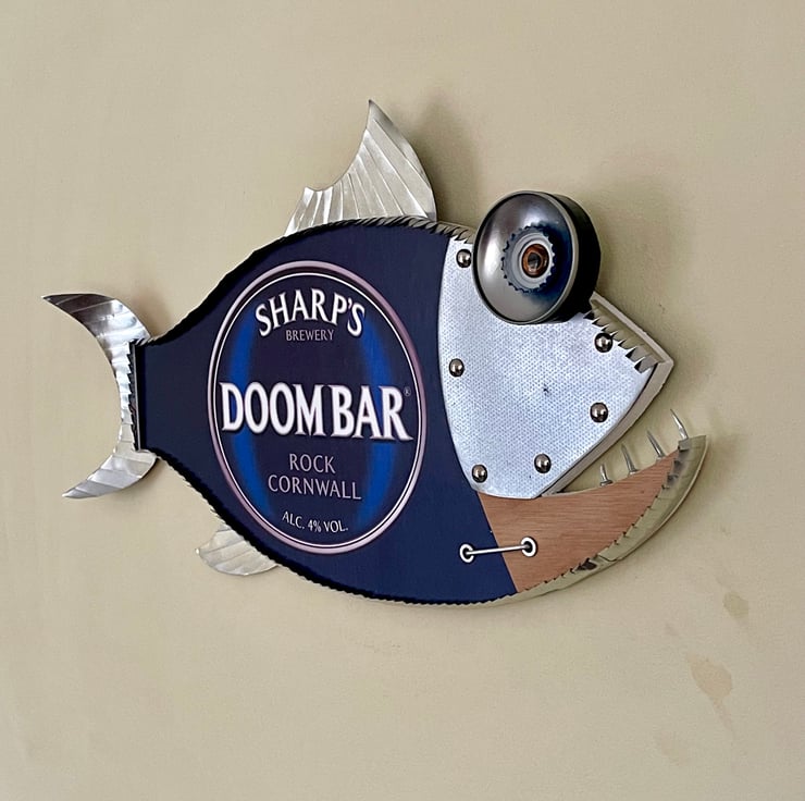 Welcome to my listing, this fish has been hand made by myself from recycled wood , Metal, bottle tops, Cans and plenty of imagination with a Doom Bar amber ale theme.