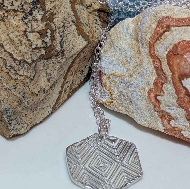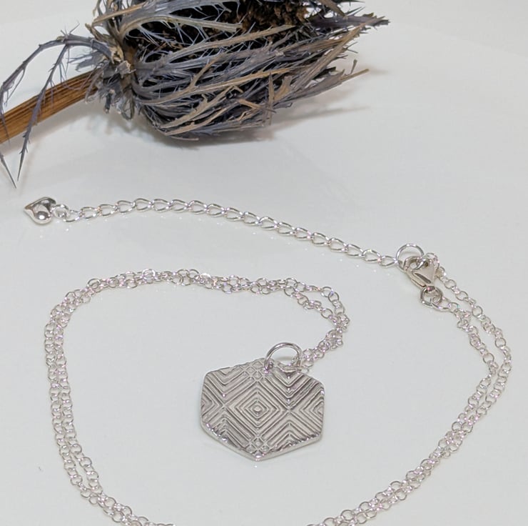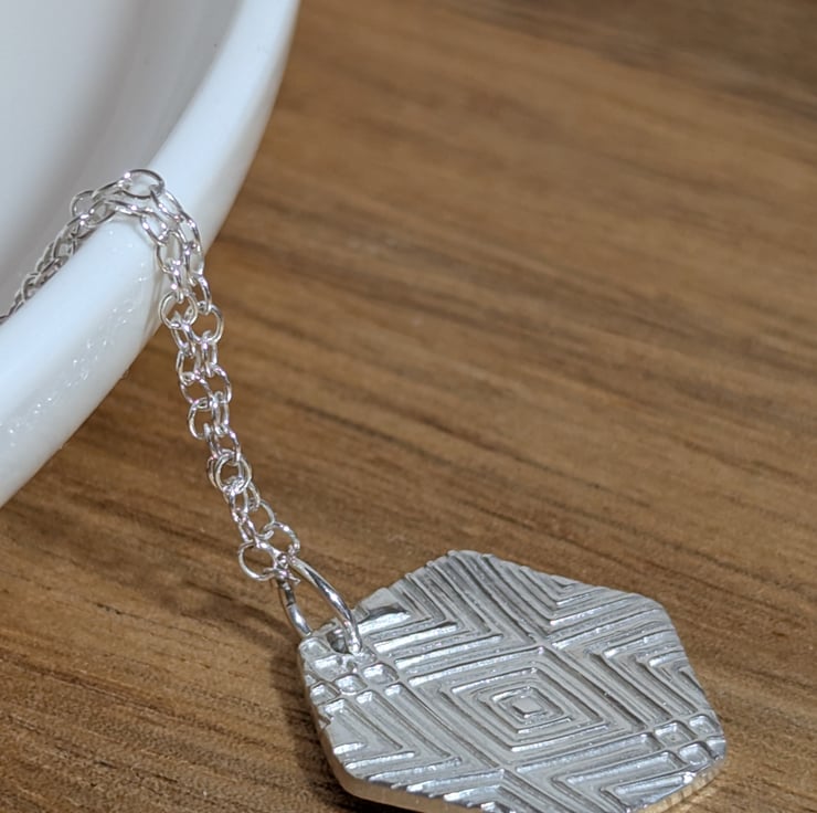 This lovely fine silver pendant is made using silver clay and textured to create the geometric pattern on the front. The chain is a 925 sterling silver 18 inch fine chain and also has a 925 sterling silver 2 inch extender chain. The pendant measures approx. 19 mm (H) x 19 mm (W).