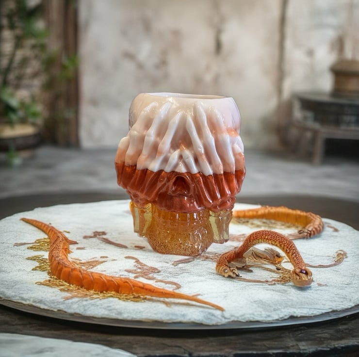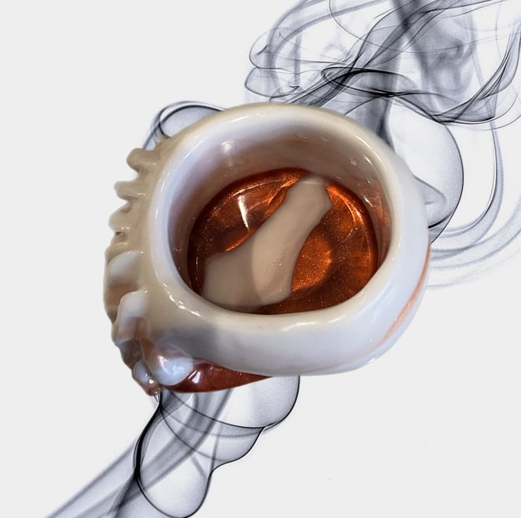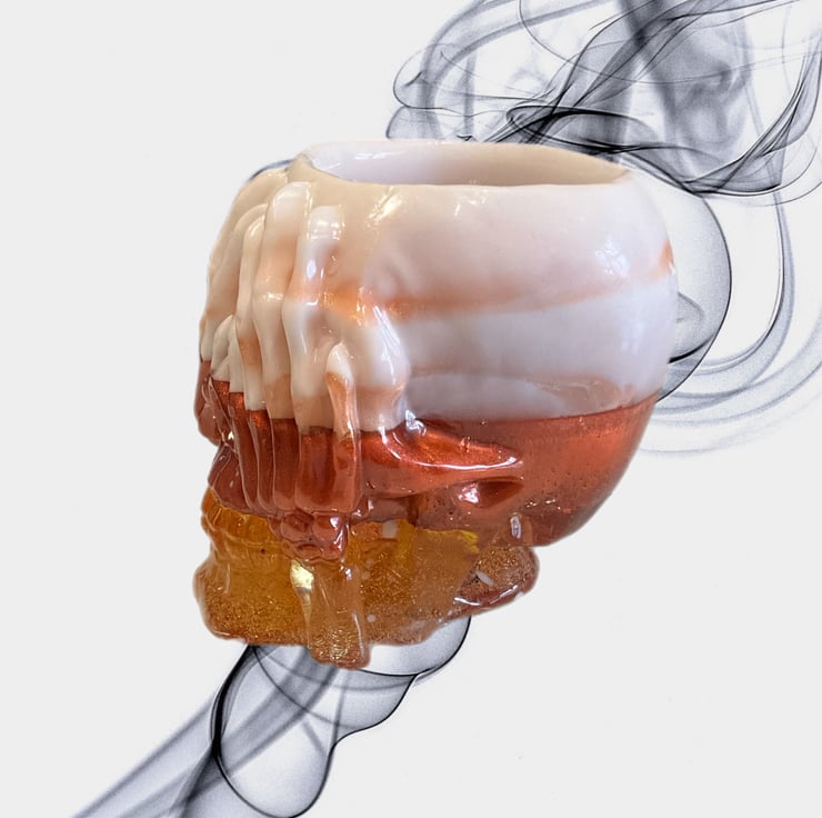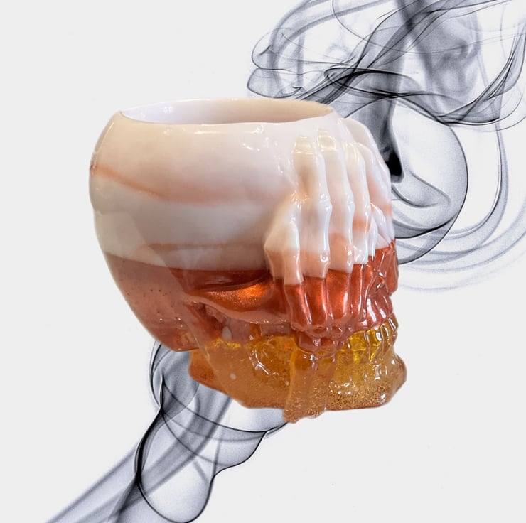 A bold and eye-catching handmade resin skull bowl featuring the striking “See No Evil” design. This piece blends creamy white into deep copper and finishes with a rich translucent amber base, creating a beautiful ombre effect.
