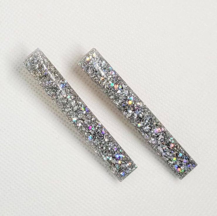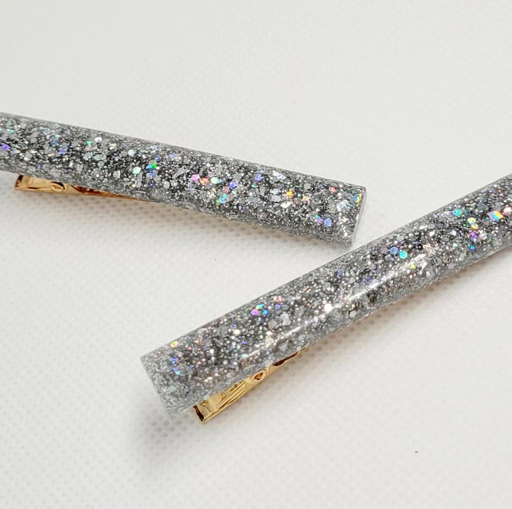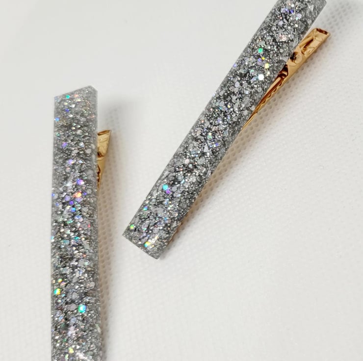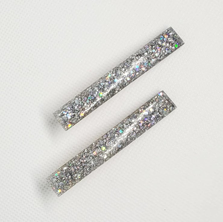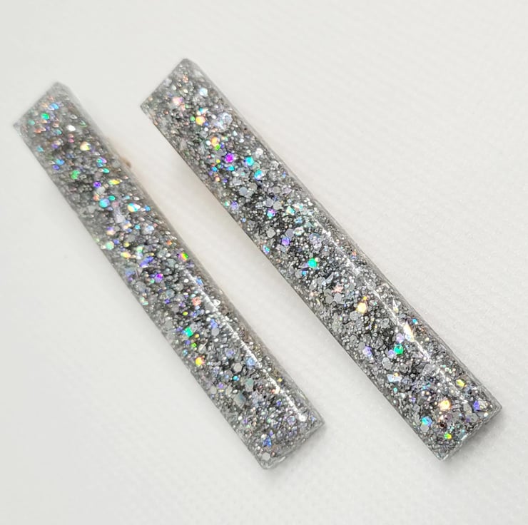 Inspired by shimmering holographic silver and a touch of celestial magic, these clips are all about dazzling sparkle and luminous glamour. Think stardust skies and rainbow reflections with a hint of unicorn mischief — designed to catch the light, captivate, and turn the everyday into something beautifully magical.