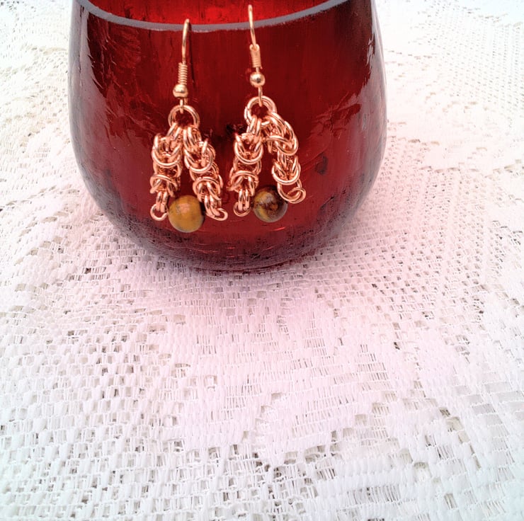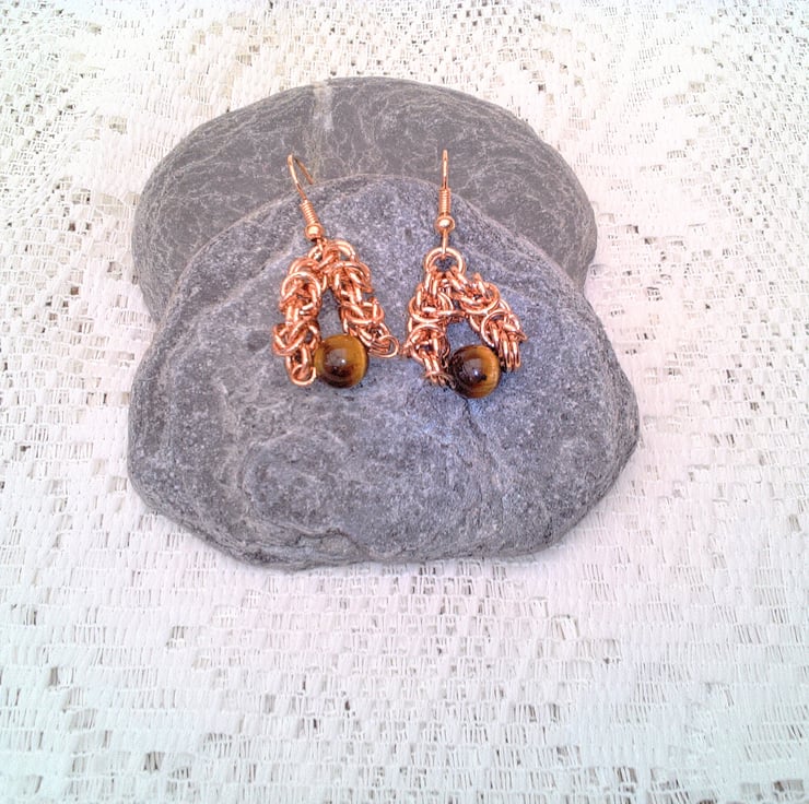 These gorgeous earrings would look great with any outfit you wear everyday or for an evening out. They would make a perfect gift for a friend or relative for a birthday or anniversary, or a lovely treat for yourself. The semi precious earrings are made using 6 mm rose gold jump rings linked together into a byzantine chain maille effect with an 8 mm round gold brown tiger's eye bead suspended on rose gold plated ear hooks with a drop of 1 inch (2.5 cm) from the base of the ear wire. The earrings will be dispatched wrapped in tissue paper in an organza bag and delivered to you via Royal Mail first class post.