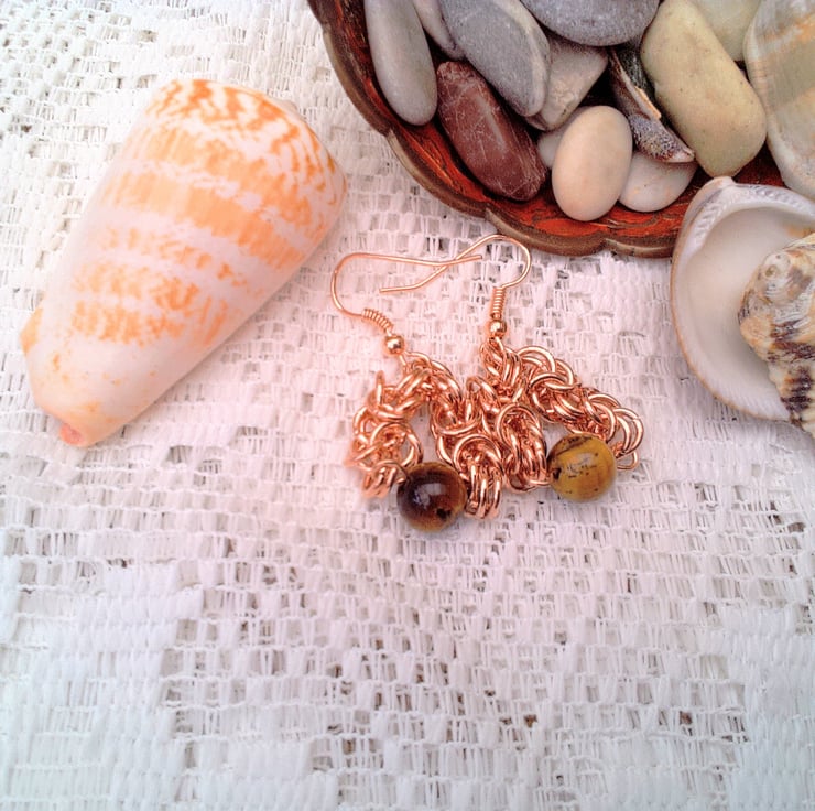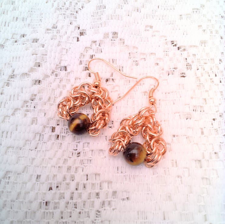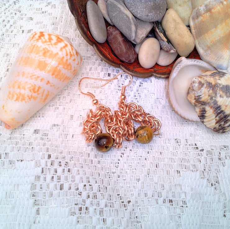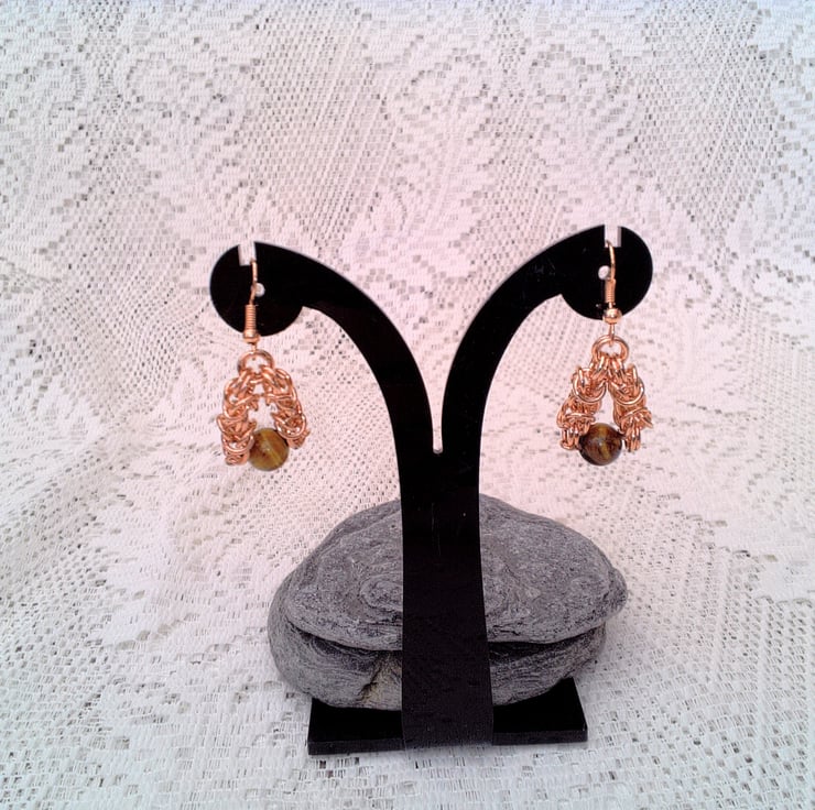 Rose Gold Byzantine Chain Maille and Tigers Eye Earrings, Gift for Her, Earrings for Pierced Ears, Gemstone Earrings, Semi Precious Earrings, Birthday Gift, Mother's Day Gift, Anniversary Gift, Chain Maille, Tiger's Eye