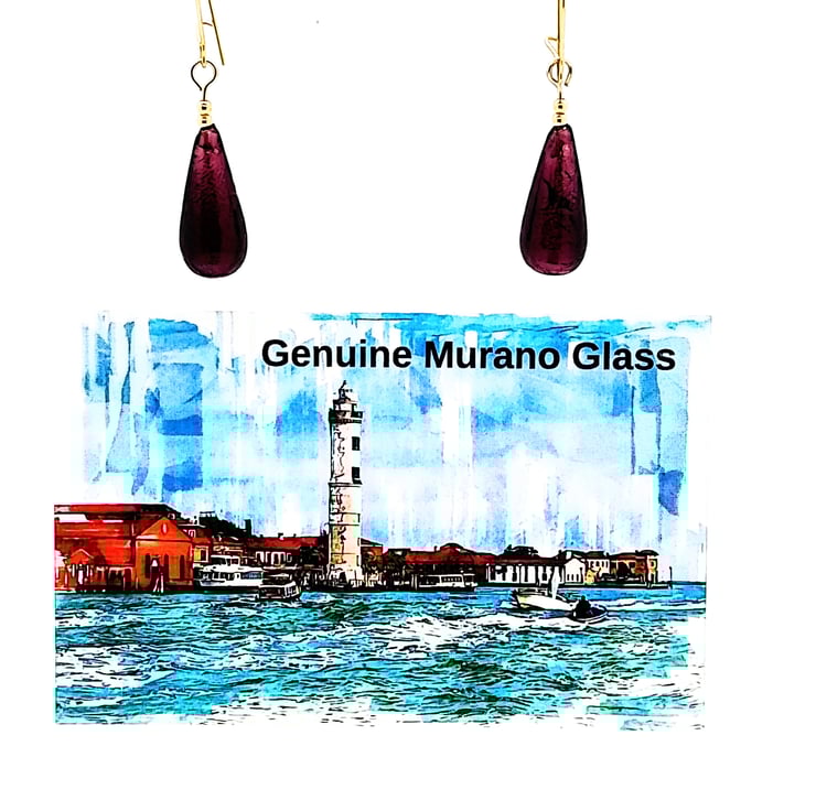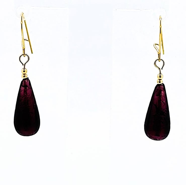 This is a pair of dark amethyst Murano glass drop earrings with gold-filled beads and ear wires. The 20 mm drop beads were handcrafted by world-renowned artisans on the island of Murano in the Venetian Lagoon, Italy.