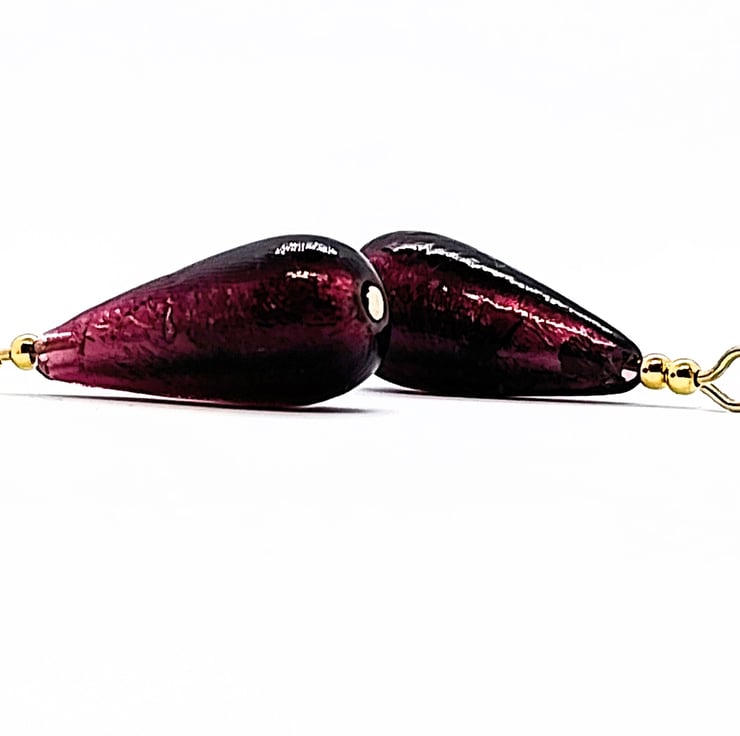 The beads have a glass core wrapped in 100% pure silver foil, which is encased in glass. The result is a beautiful bead in a dark amethyst shade. Two gold-filled beads sit on each focal bead, and the earrings are finished with gold-filled ear wires for allergy-free wear. The earring drop is approximately 4 cm.
