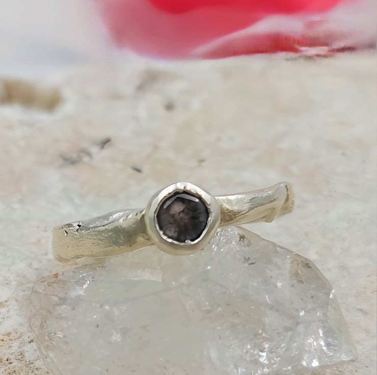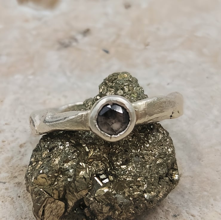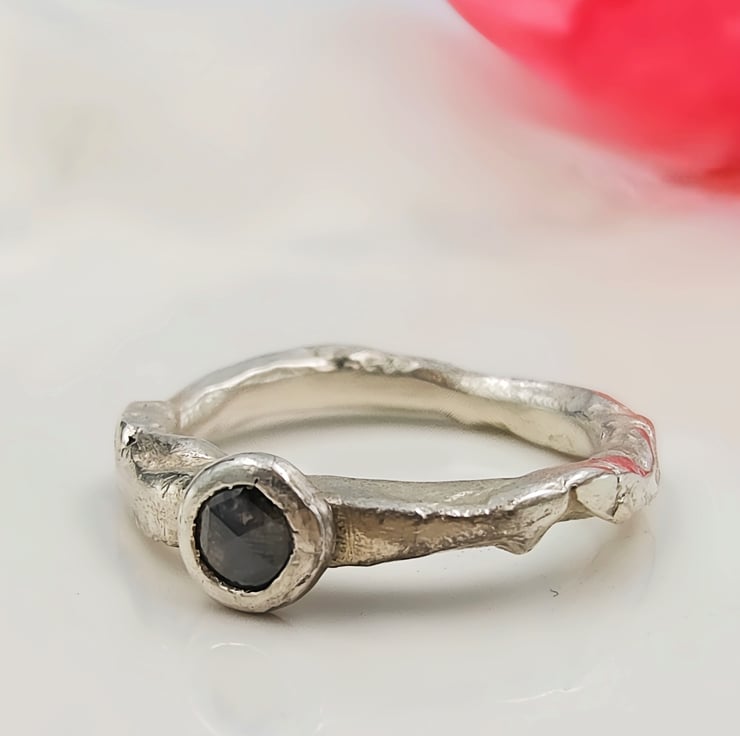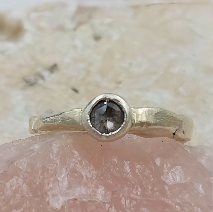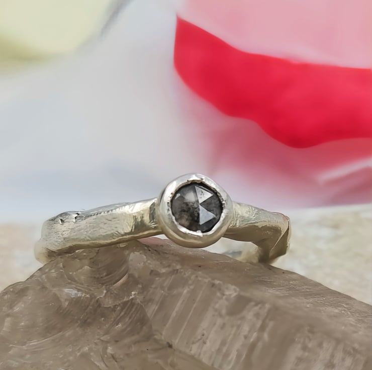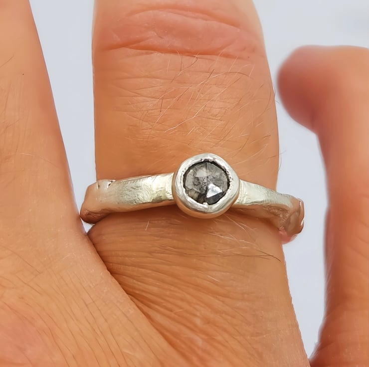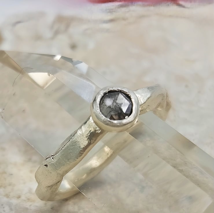 A one-of-a-kind 4.6mm rose cut salt & pepper diamond set in molten recycled silver. Unique, handmade engagement ring full of natural, organic beauty.