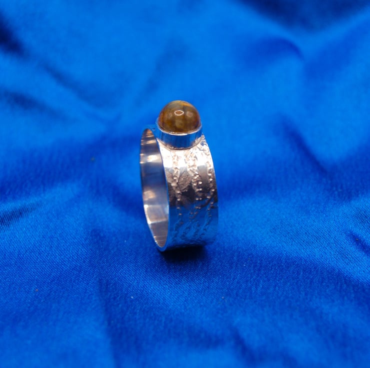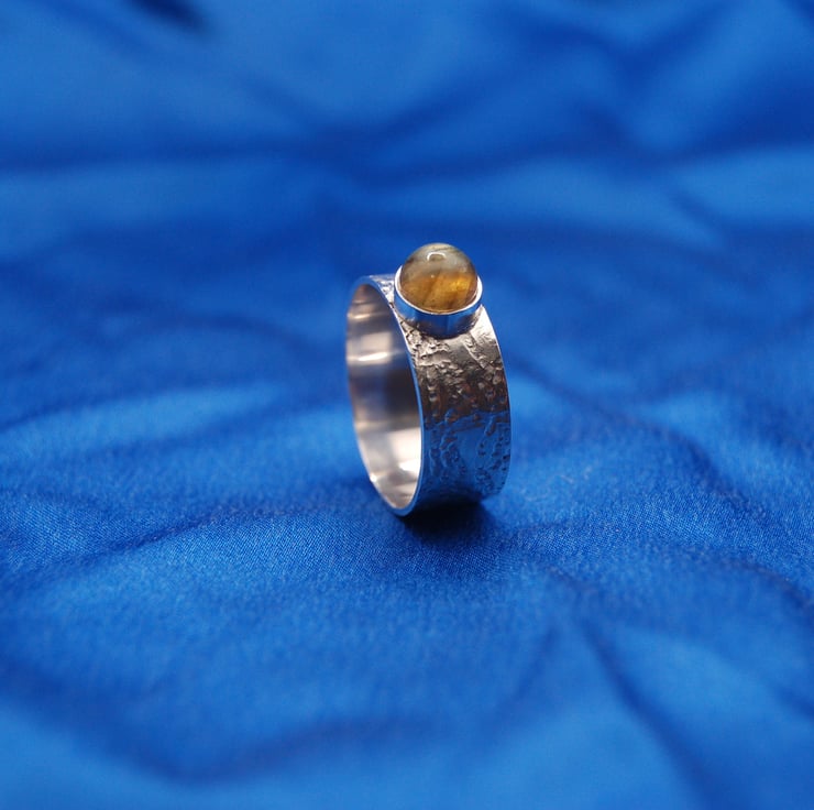 Unique handmade silver ring is made from recycled 925 sterling silver with lace imprint pattern. Set with 6 mm diameter Labradorite cabochon which is used in crystal healing to shield against negativity, enhance intuition, and boost self-confidence. This size O ring is perfect for those looking for a unique and fine jewellery piece to elevate their outfit, and would make a stylish addition to any jewellery collection. Made with attention to detail and exquisite craftsmanship, This, ring is a versatile accessory that can be worn for any occasion.