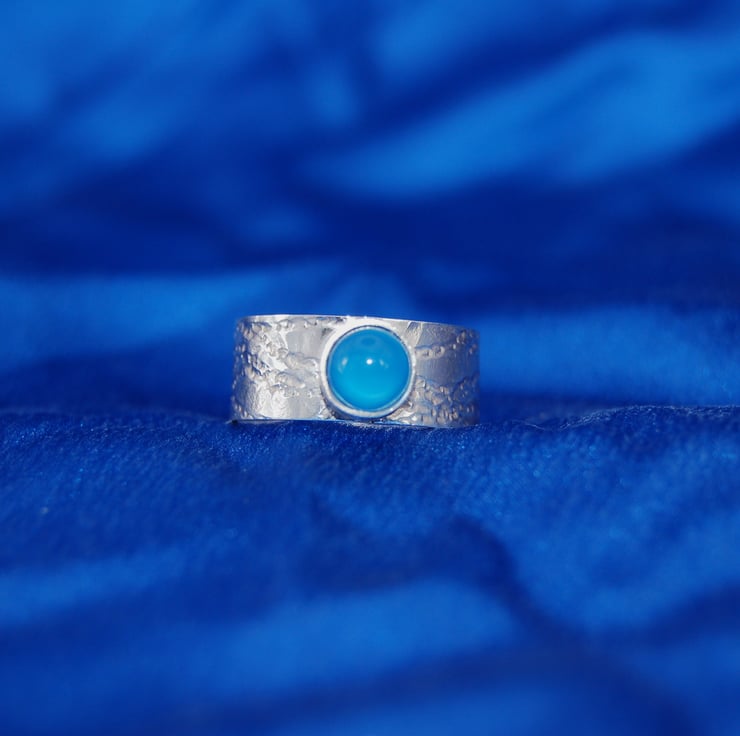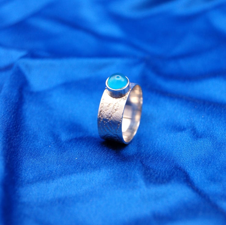 Unique handmade silver ring is made from recycled 925 sterling silver with lace imprint pattern. Set with 6 mm diameter Blue Agate cabochon which is used in crystal healing for promoting emotional balance, communication, and confidence. This size N ring is perfect for those looking for a unique and fine jewellery piece to elevate their outfit, and would make a stylish addition to any jewellery collection. Made with attention to detail and exquisite craftsmanship, this ring is a versatile accessory that can be worn for any occasion