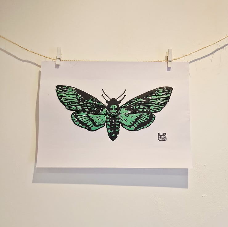 This original 2 layer Death Moth lino print was dreamed up, carved, and hand-pressed by me in Cheshire.