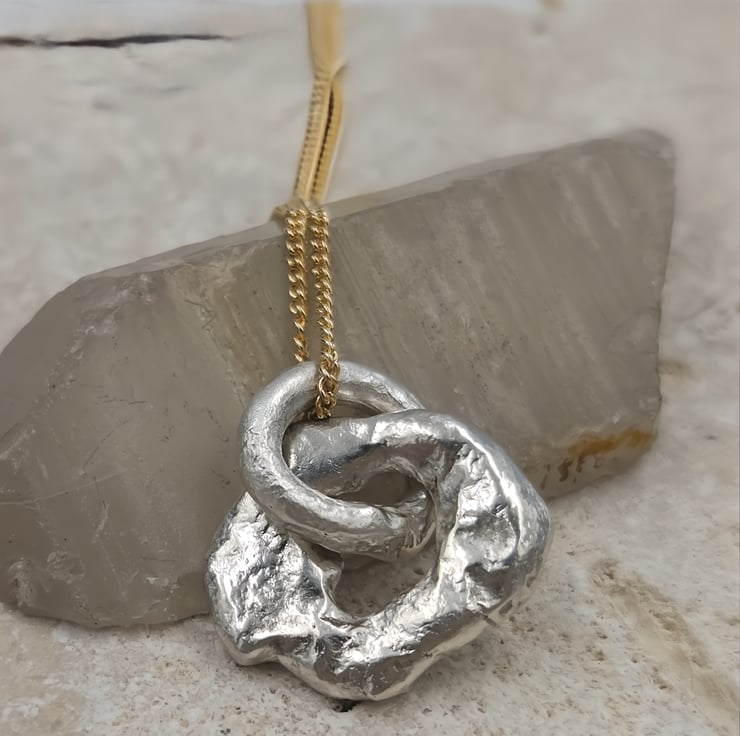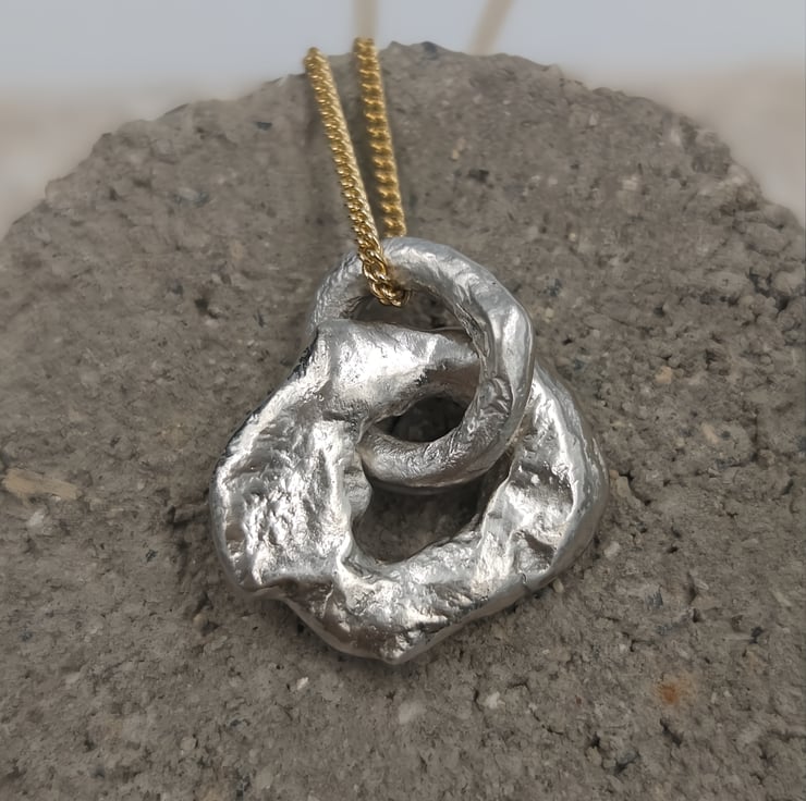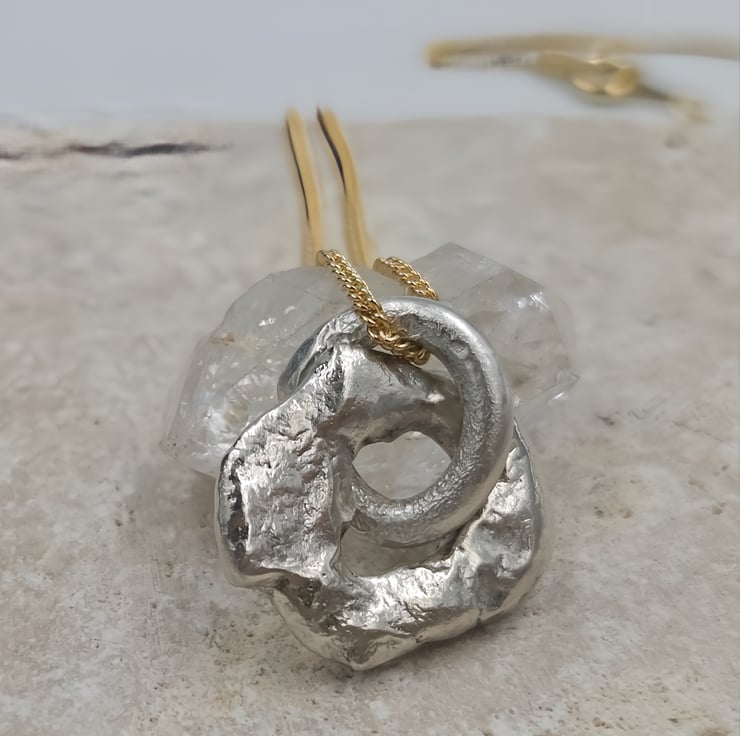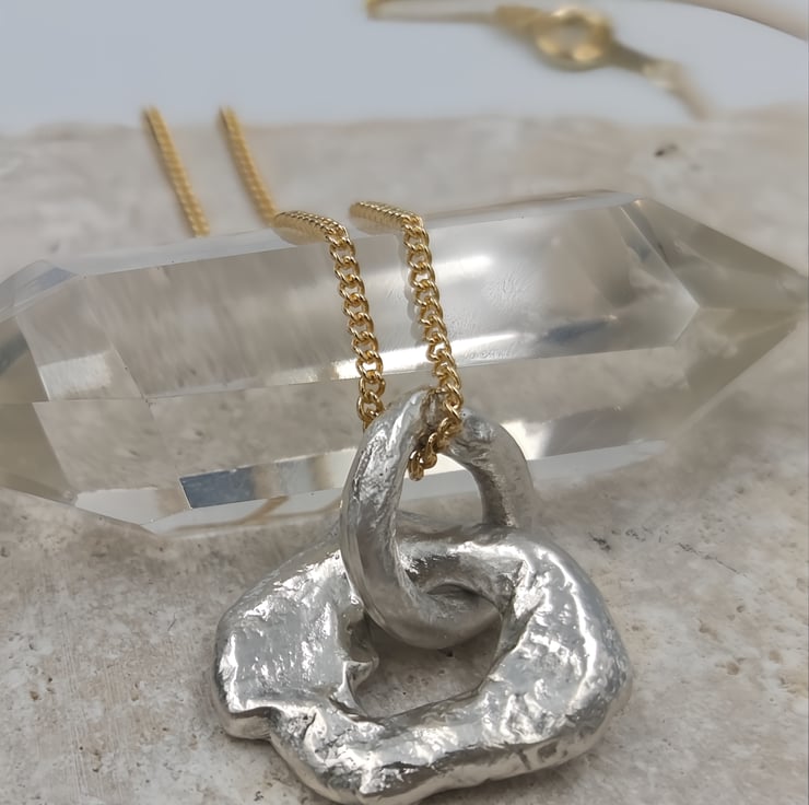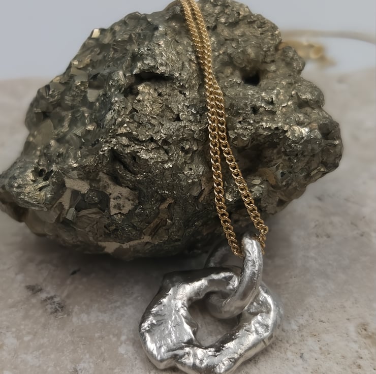 Suspended on a gold plated chain, this mixed metal design balances raw, molten silver with warm golden tones—perfect for effortless everyday wear or layering with other favourites. Each piece celebrates imperfection, craftsmanship, and individuality.