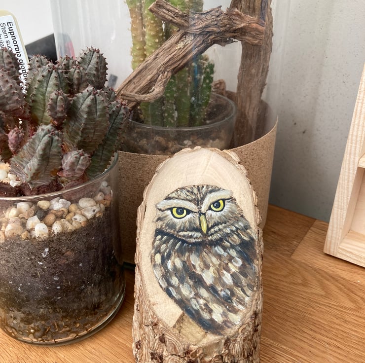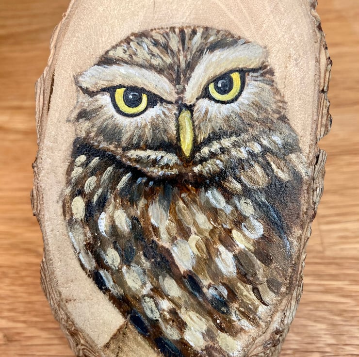 I have used reclaimed wood from my garden to create a small portrait of a little owl which would make a great gift for any owl or bird lover or add a touch of natures whimsy to your home.