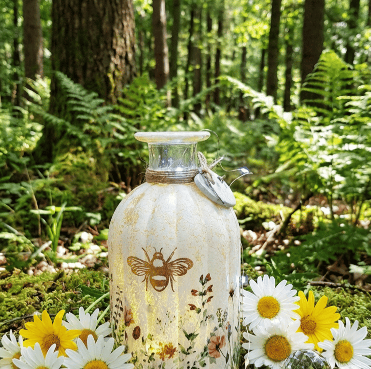 Pretty meadow florals have then been added to feature a gold been on the front & a butterfly on the back.
