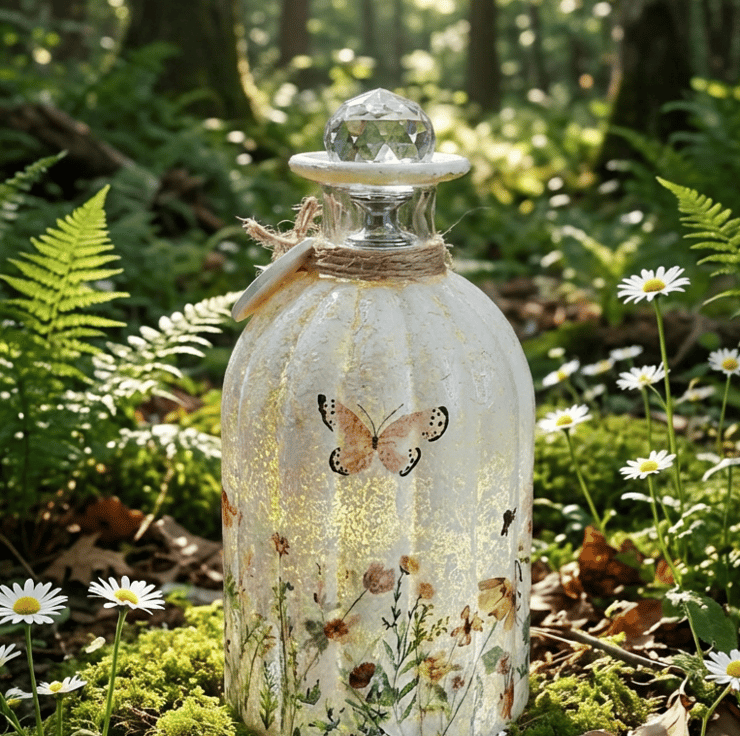 With the addition of battery fairy lights, with a crystal topper, this makes it into a lovely Lamp with a soft glow.