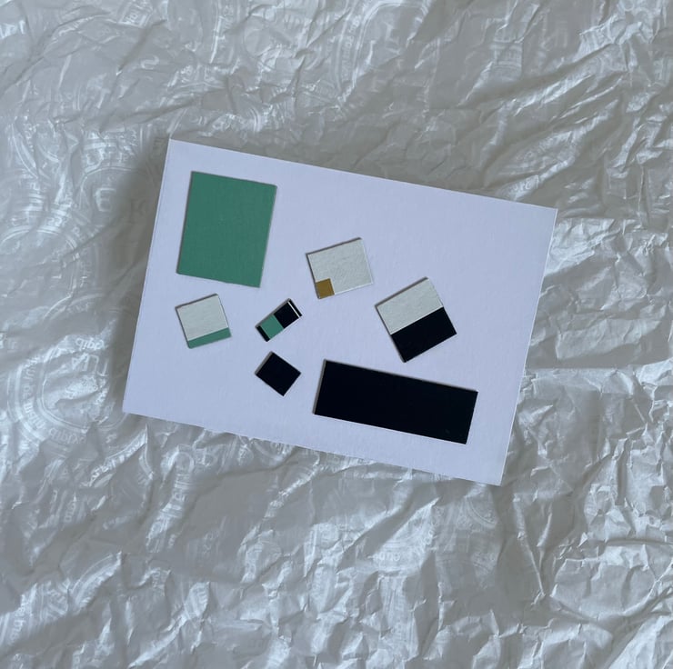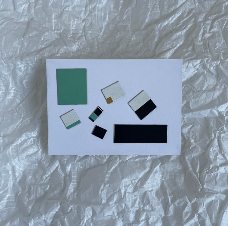 Materials: white card 300gsm; water-based glue; upcycled colour-printed card