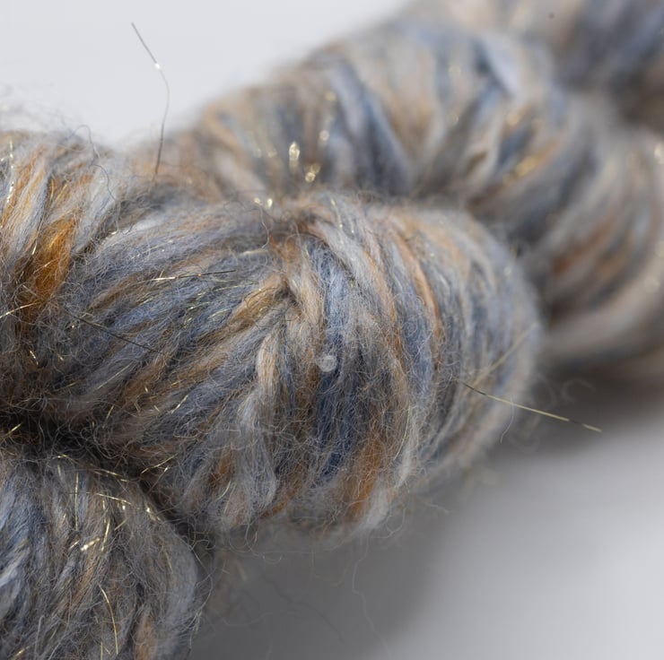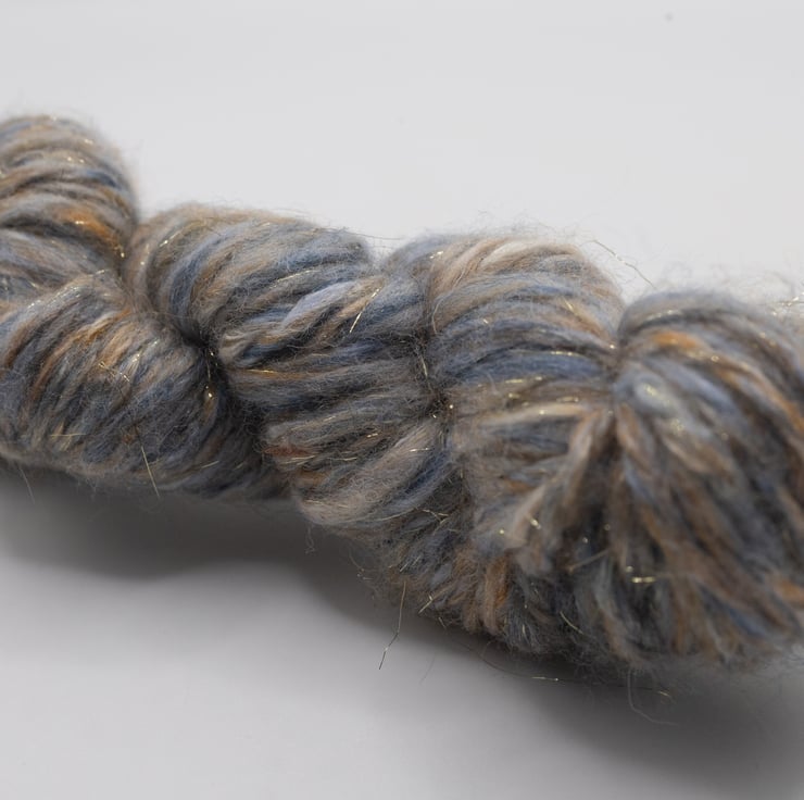 Pale blue and brown handspun yarn suitable for weaving, crochet, knitting and other fibre art projects.