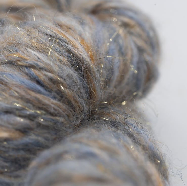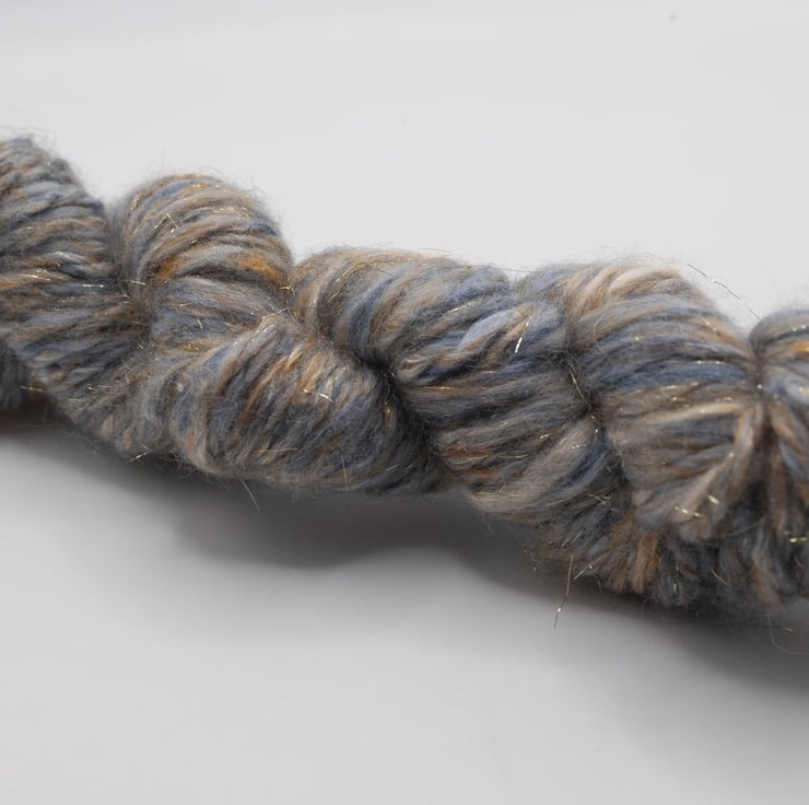 The yarn is spun on a spinning wheel from a batt and plied to create a unique skein and weighs 25g.