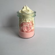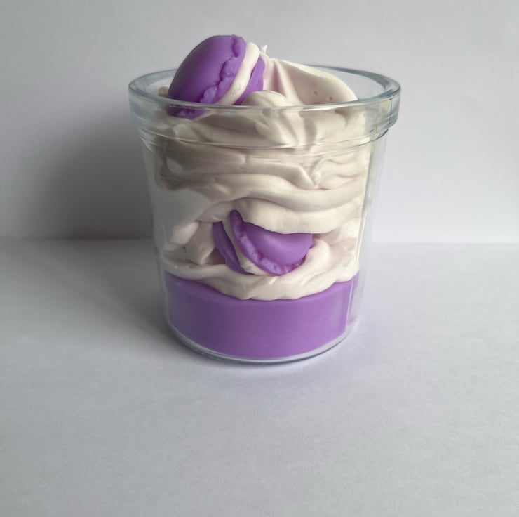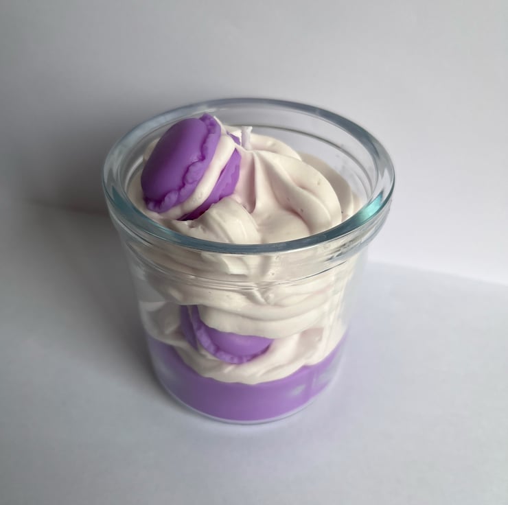 A beautifully handcrafted candle featuring elegant purple and cream tones with macaron-shaped wax details. The candle is finished with a whipped-style wax top and presented in a clear glass jar, creating a soft and decorative look.