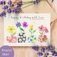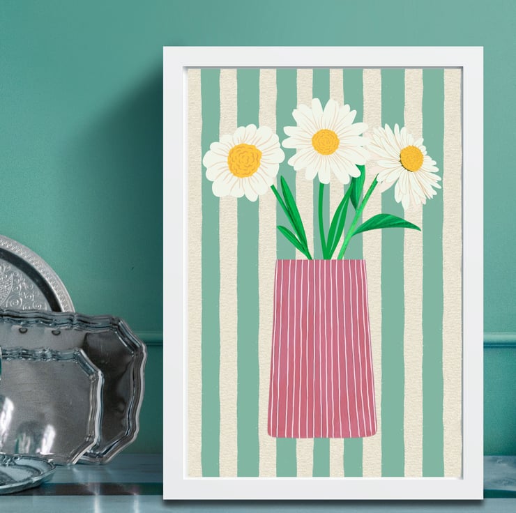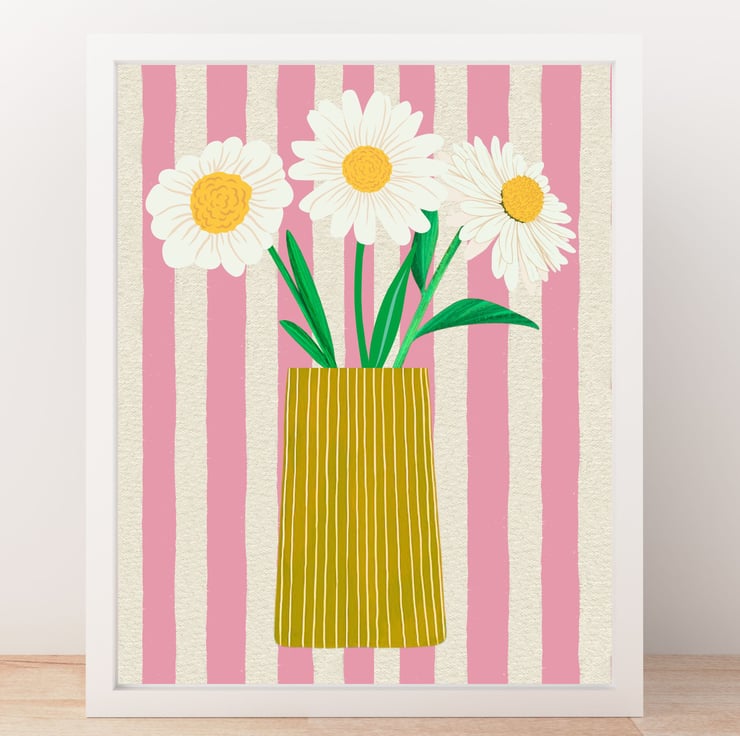 This bold Daisy print has been exclusively designed by me at Mabel & Me, features 3 hand painted daisies in a vase with a bold striped background and is available in 3 colorways.