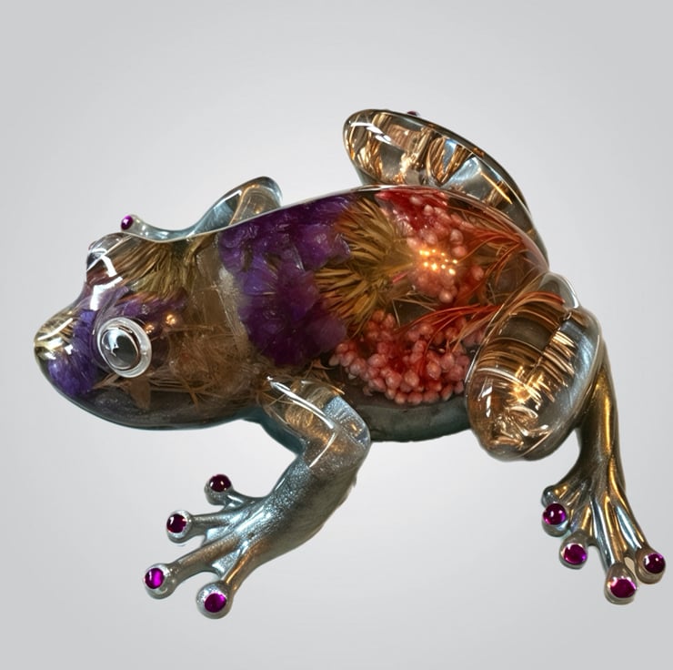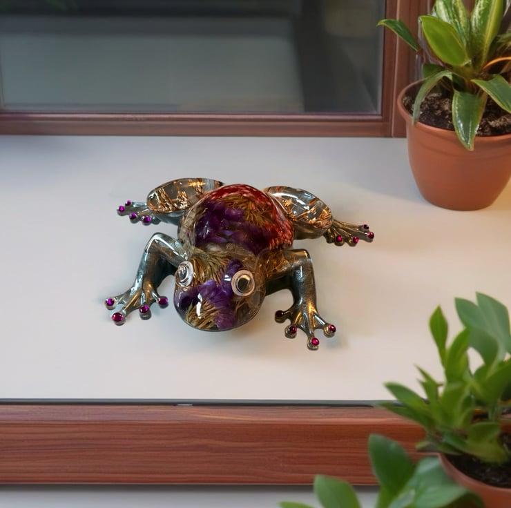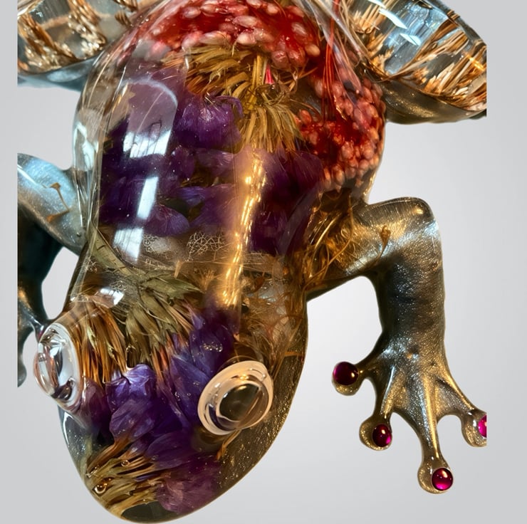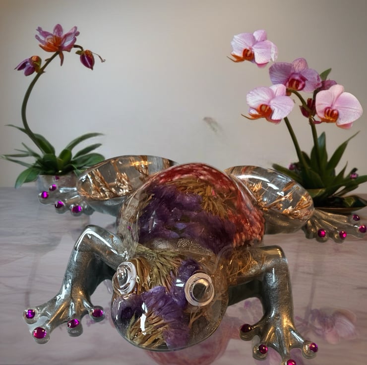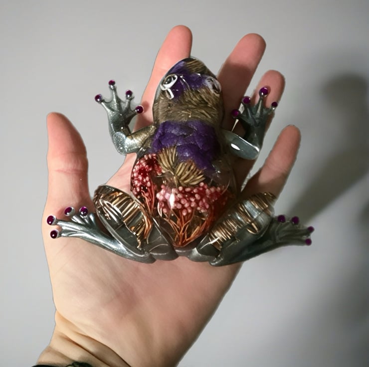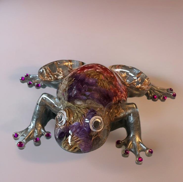 This frog was inspired by my love of nature and the small hidden worlds found in gardens and wild places. I wanted to capture the feeling of a frog resting among flowers and grasses, so I preserved real dried botanicals inside the resin to create a tiny botanical scene within its body. Each plant was chosen for its colour and texture, giving the piece a natural, woodland feel.