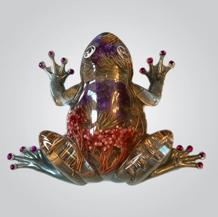 The frog’s metallic legs shimmer softly while the tiny jewel-like toes add a playful pop of colour. With its wide curious eyes and floral core, this piece feels both whimsical and elegant – perfect for anyone who loves nature, frogs, or unusual handmade art.