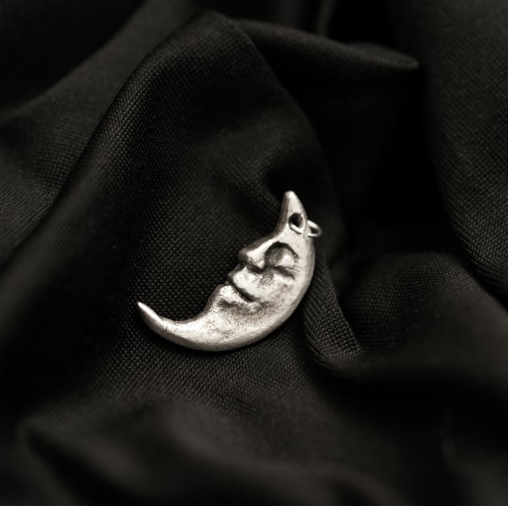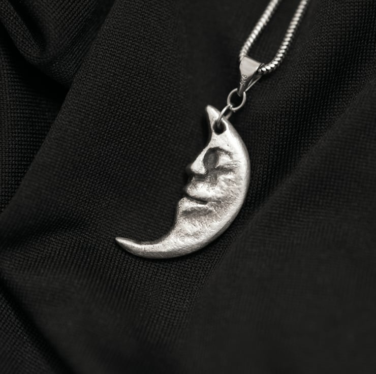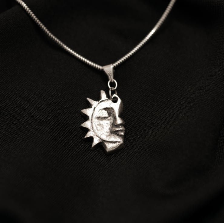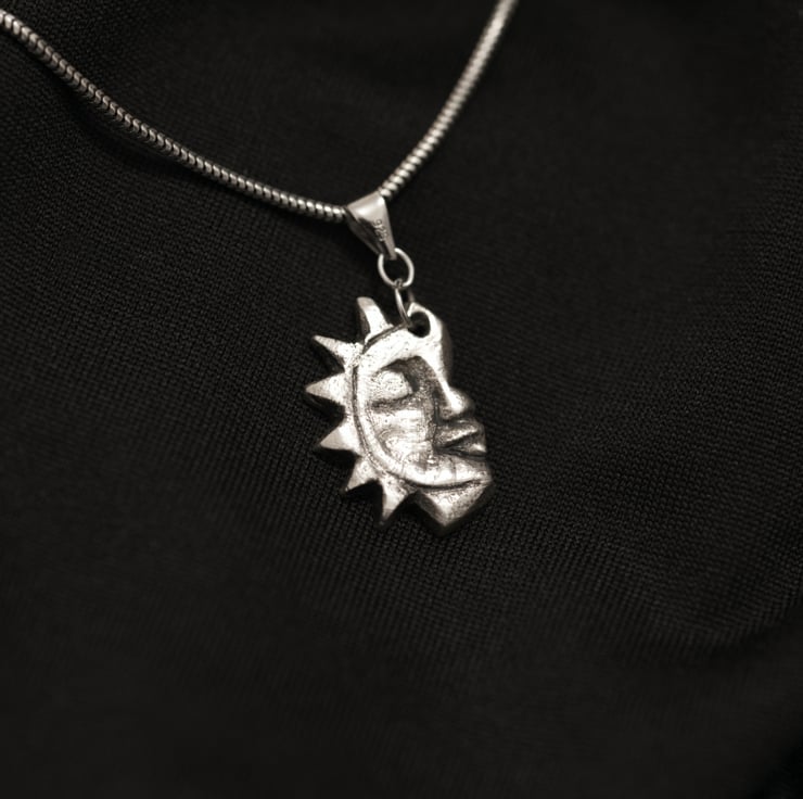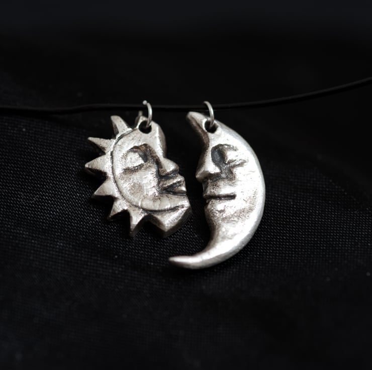 A pair of fine silver pendants handmade in Cornwall, one depicting the sun, the other the moon, with subtle texture and detail. Perfect for lovers of symbolic jewellery, nature-inspired design, or those drawn to celestial motifs.