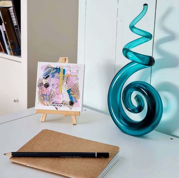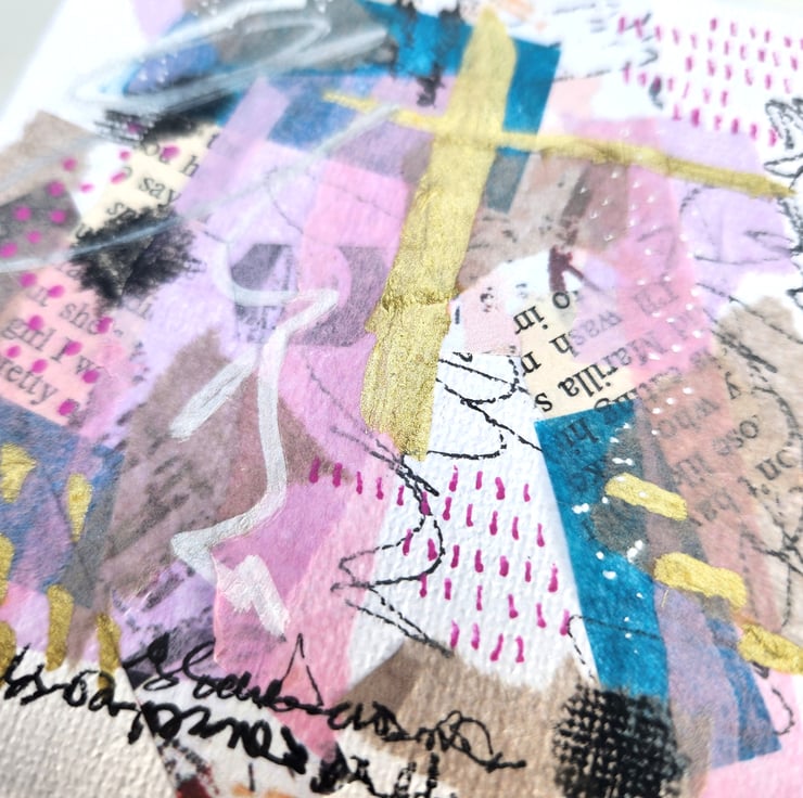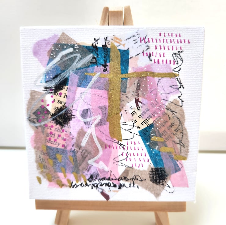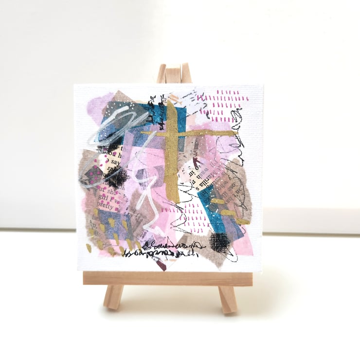 Original abstract painting made with acrylic paint, collage and Pen and Ink. the surface is a small canvas. It can be displayed on your wall or on the included mini easel. Completely unique, handcrafted work, no two of my pieces are the same.