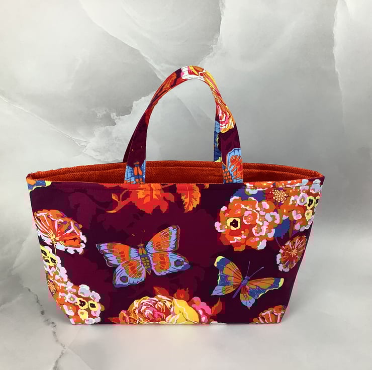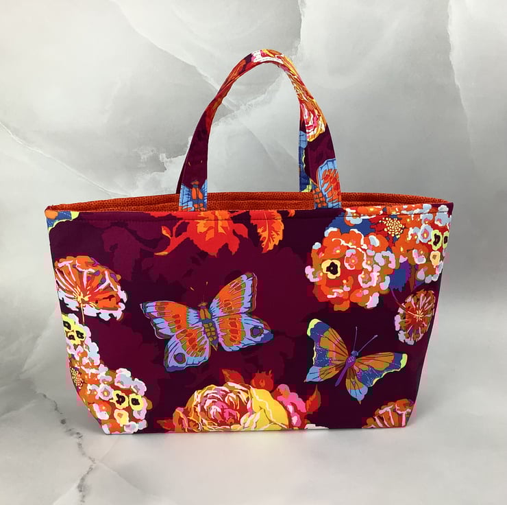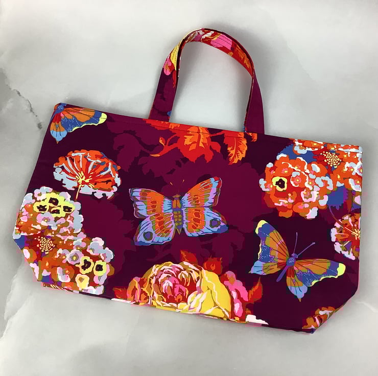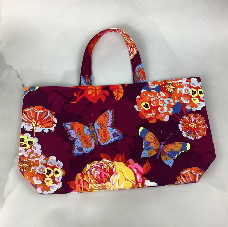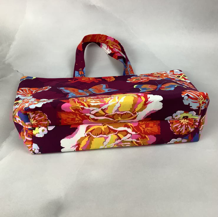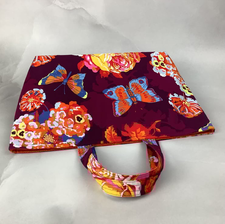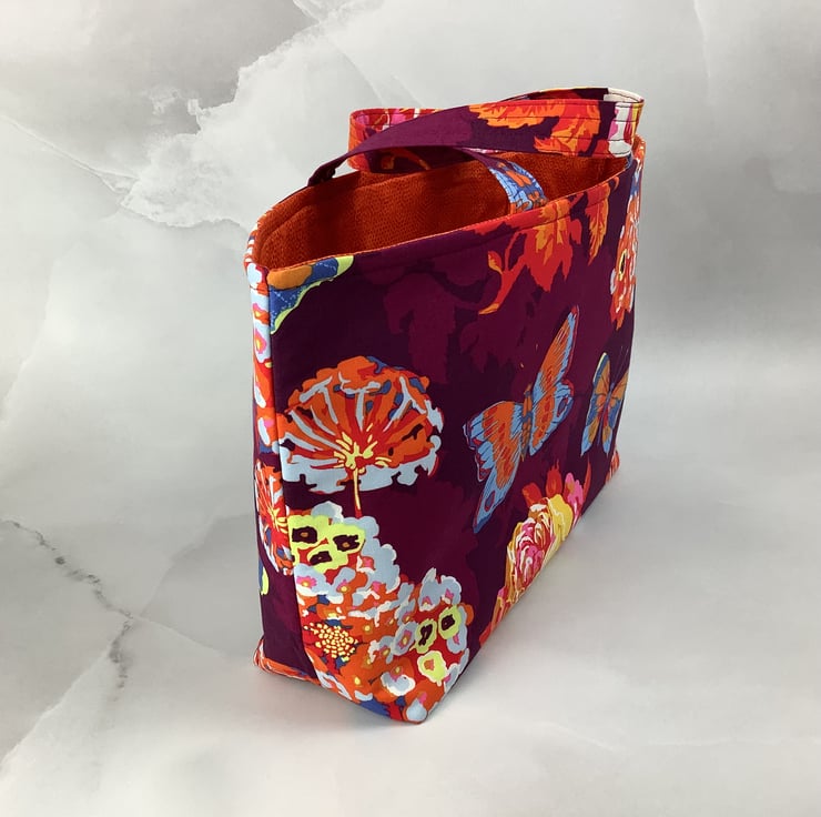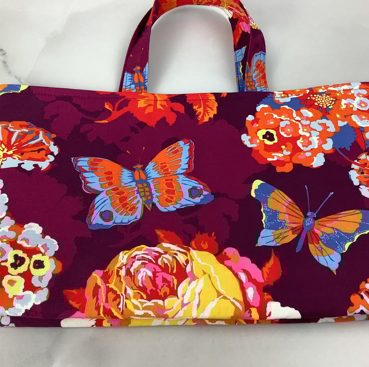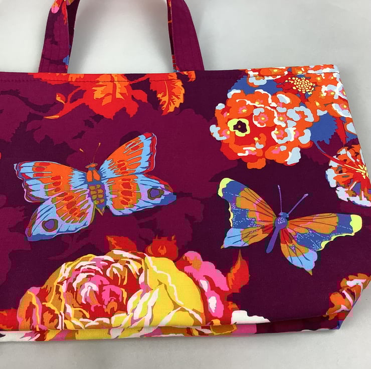 A stunning tote bag in a bold cotton fabric with gorgeous flowers and butterflies. Perfect for shopping, work and holidays and folds flat for storage.