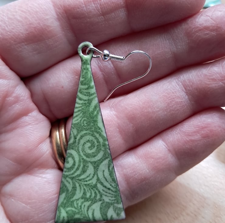 These earrings measure 2cm wide x 5.3cm long. The pattern is a dark green on a light green base. They are on a copper shape and enamelled in dark green on the reverse. The ear wires are silver plated.