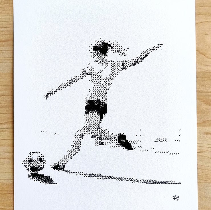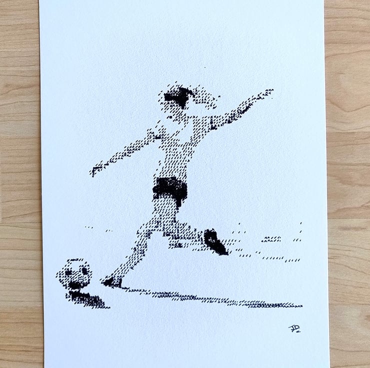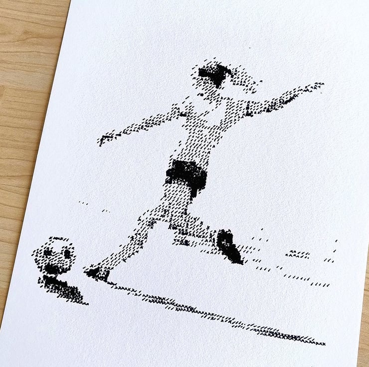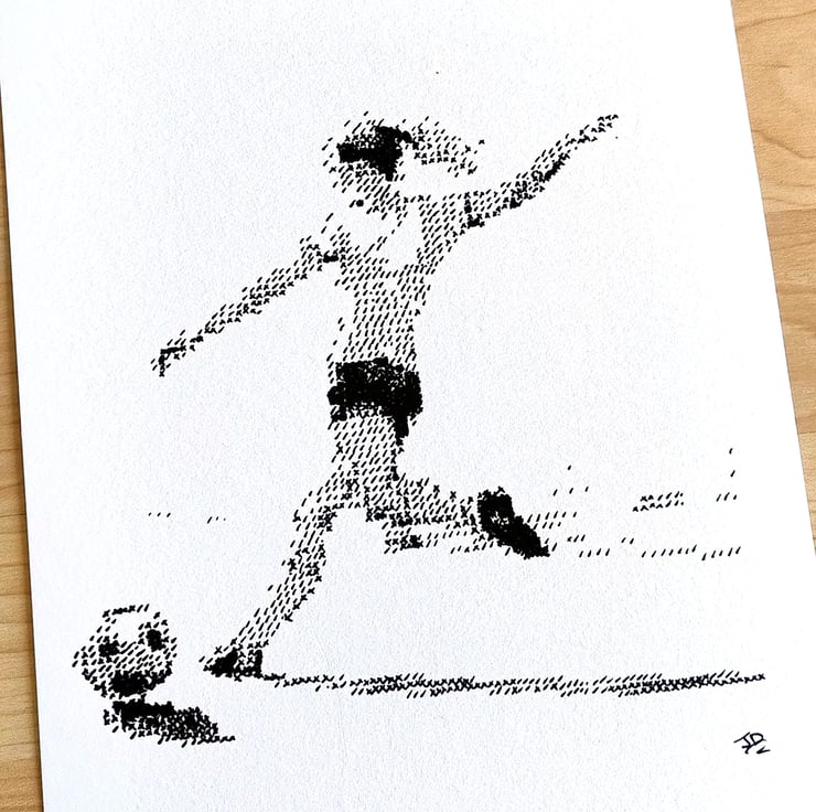 This piece depicts a female footballer in a moment of powerful concentration, mid-strike. Rather than traditional shading, the image is meticulously built using a stylized "cross-hatch" technique, where thousands of tiny 'x' and '/' marks come together to create form, depth, and movement.