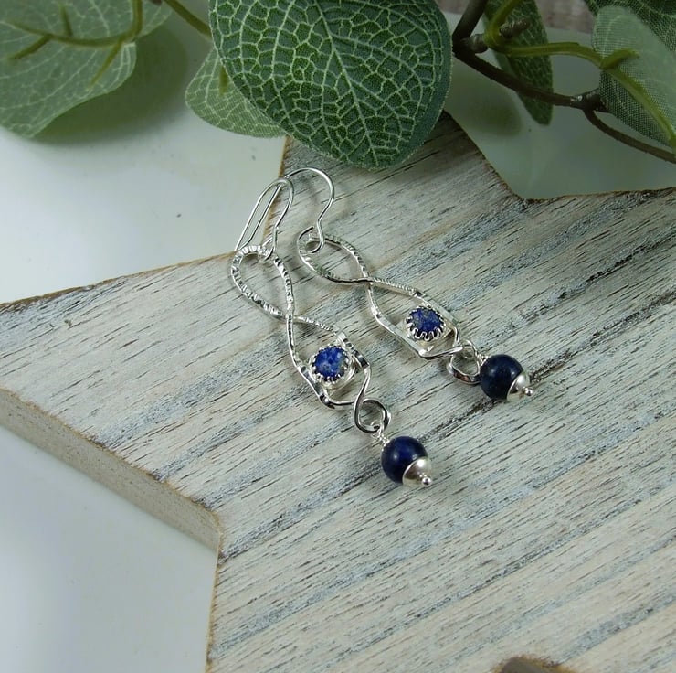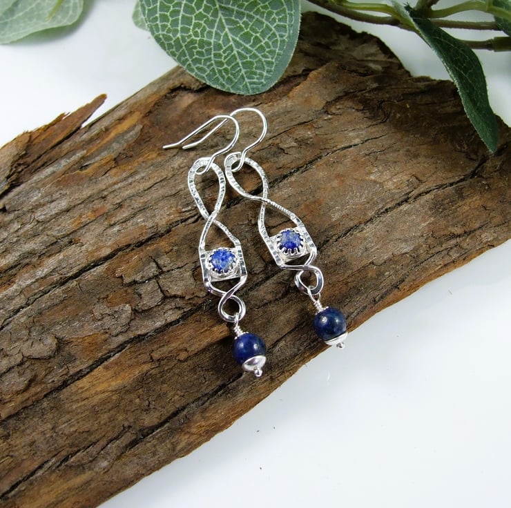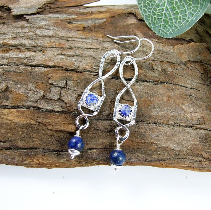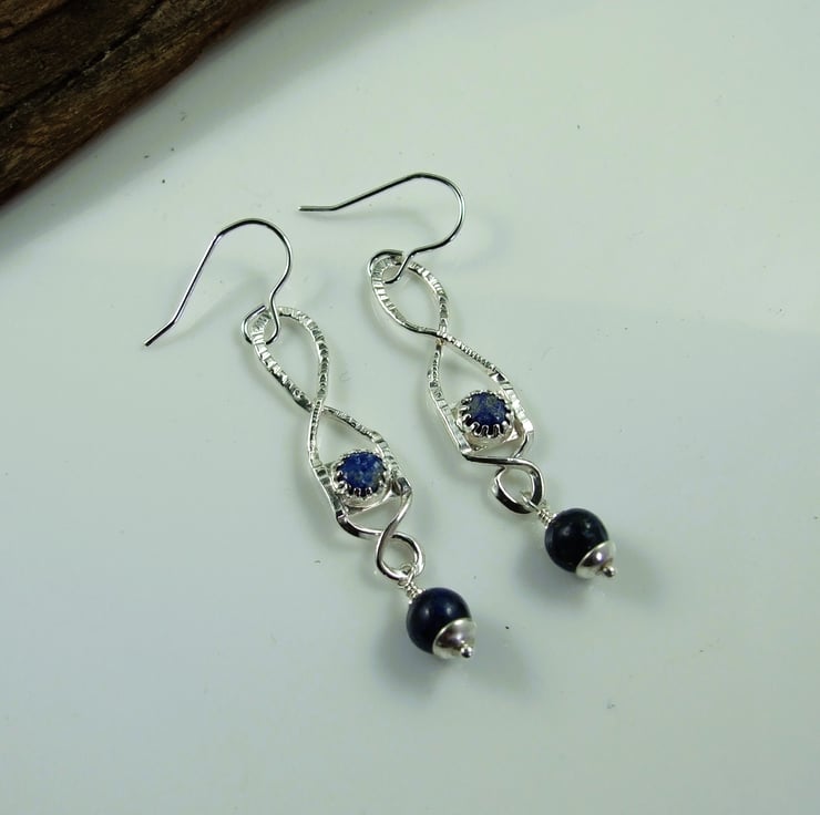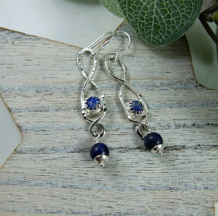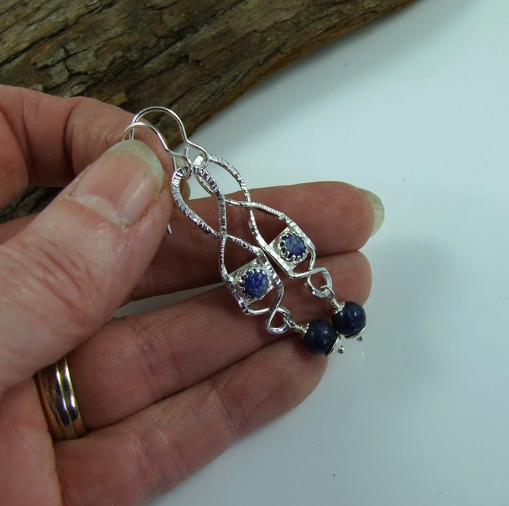 I began by created the twisted shape by hand using recycled silver wire and textured with a hammer. I then made small cup settings to hold 4mm lapis lazuli cabachons, all soldered securely together. At the bottom of the droppers I have added another 6mm lapis lazuli gemstone bead securely wire wrapped in place and fitted to .925 sterling silver ear hooks.