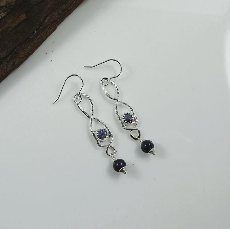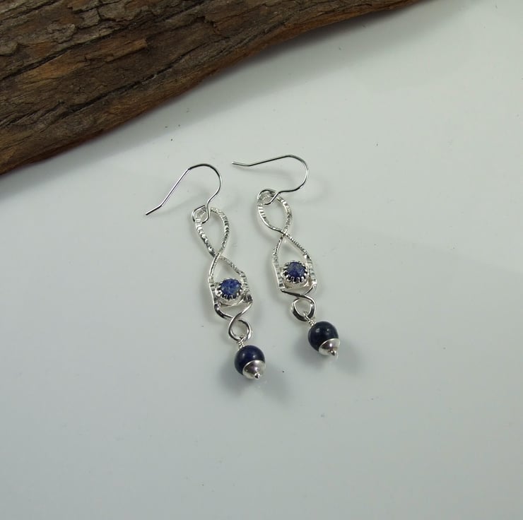 Sterling Silver Earrings. Unusual dropper earrings with lapis lazuli gemstones.
