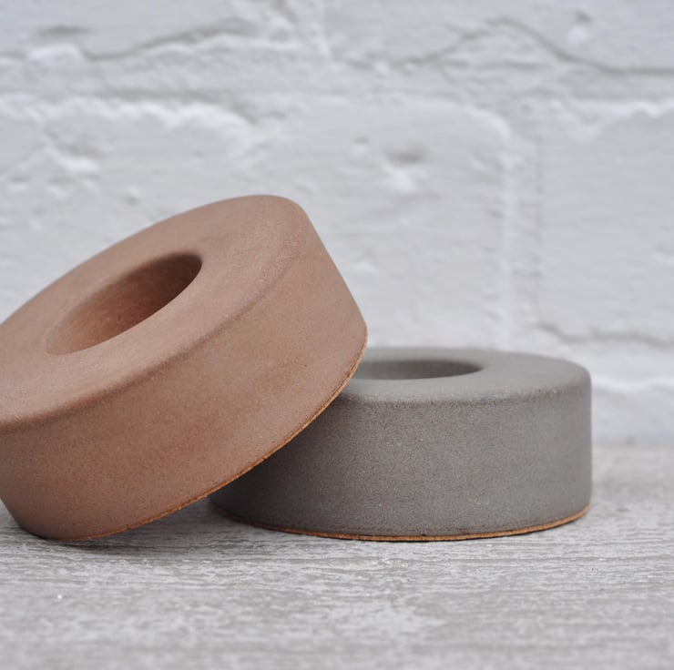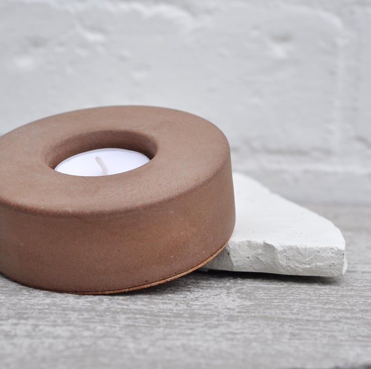 This terracotta-colored brutalist-style tea candle holder is sculpted from hand-poured concrete. Its minimalist design complements any modern or industrial decor, adding a stylish touch to your space while holding your tea candles securely.