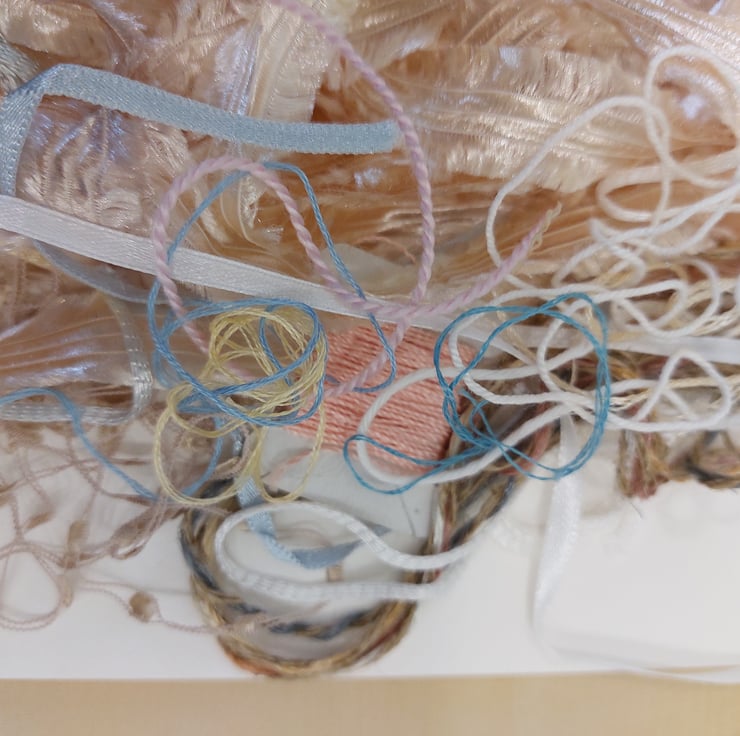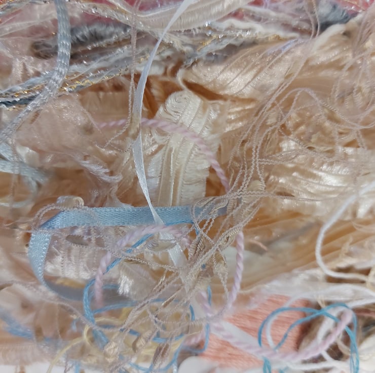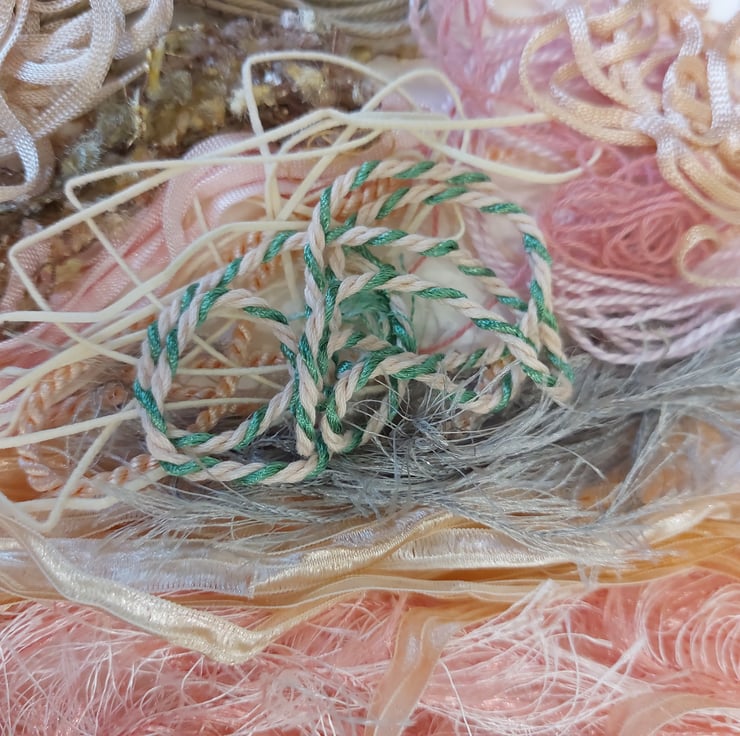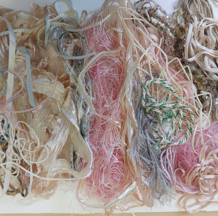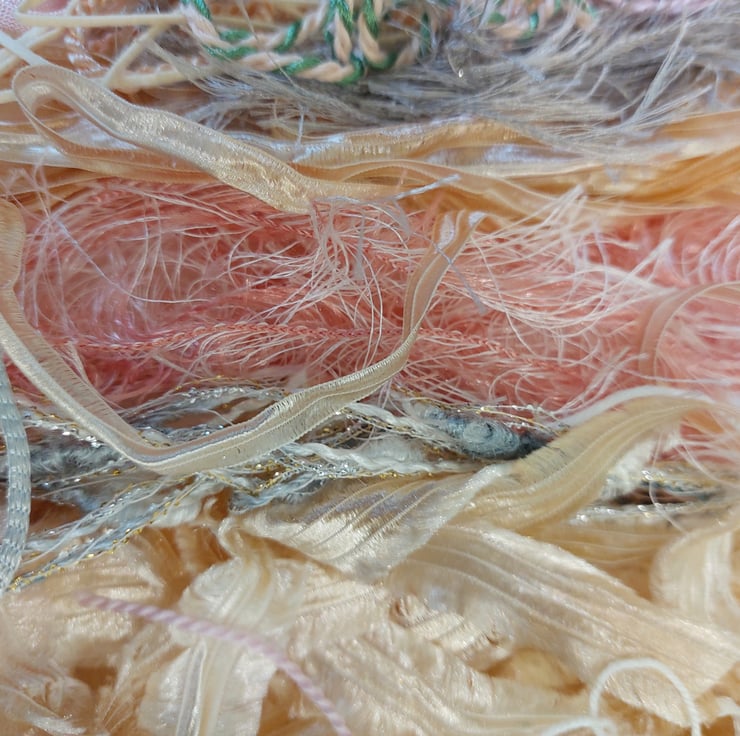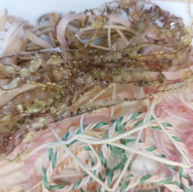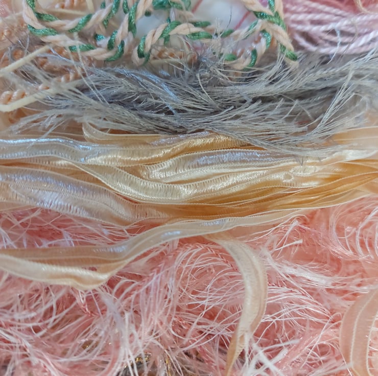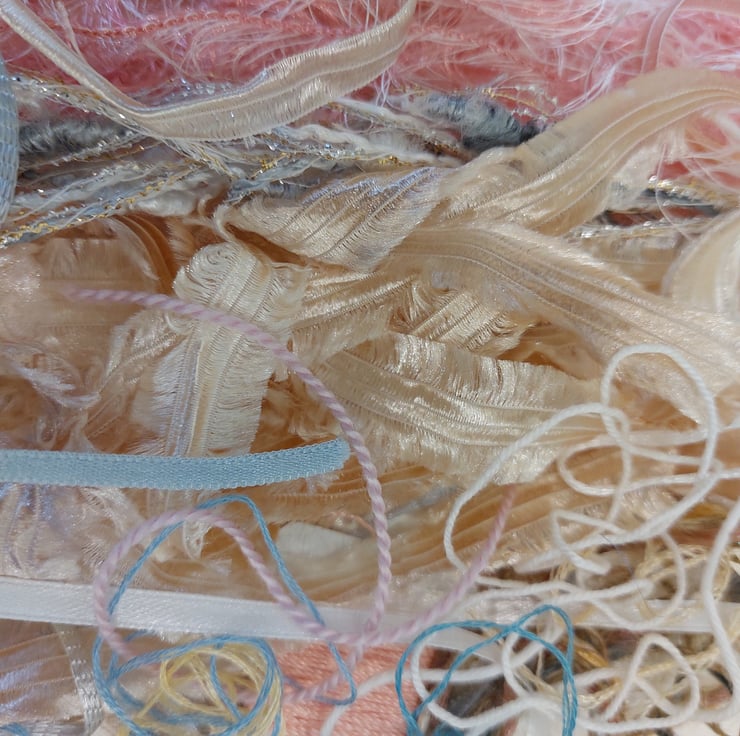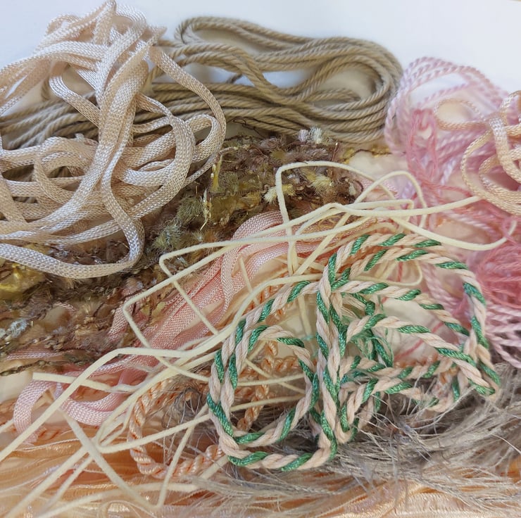 This gorgeous pack contains various textured yarns, threads and ribbons in muted pastels, ideal for embroidery, and fibre collage