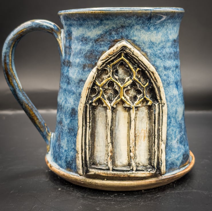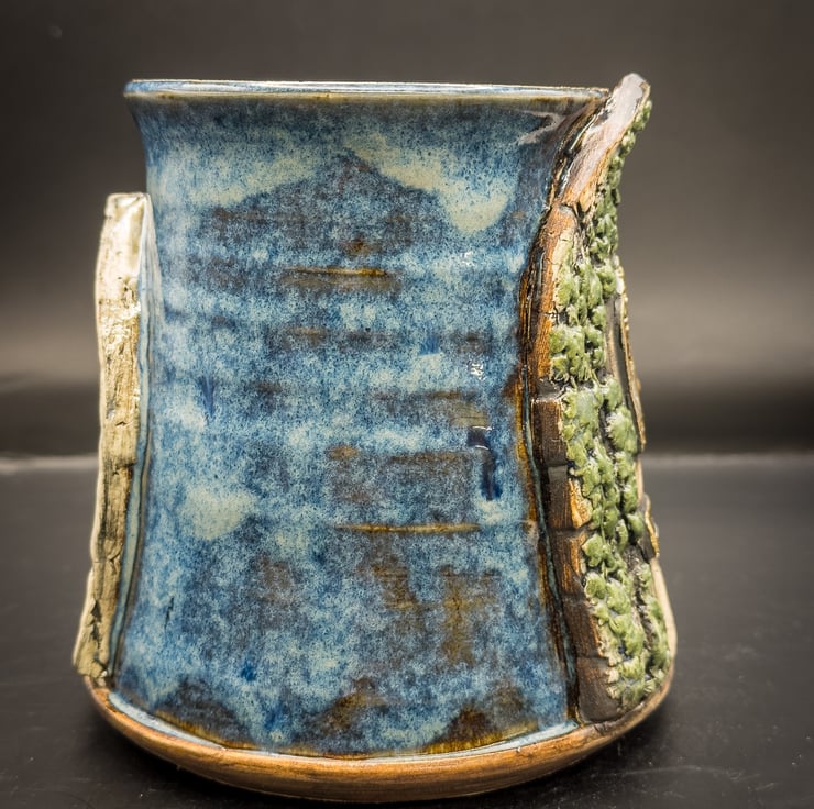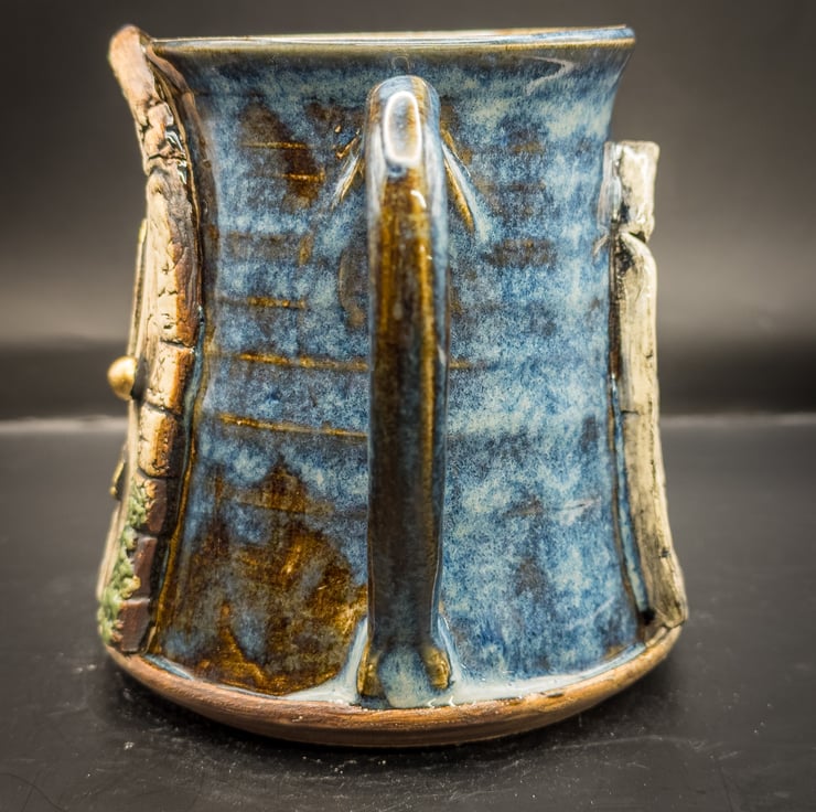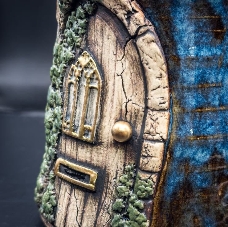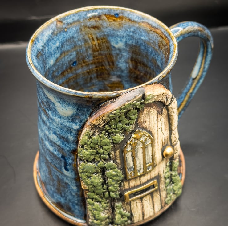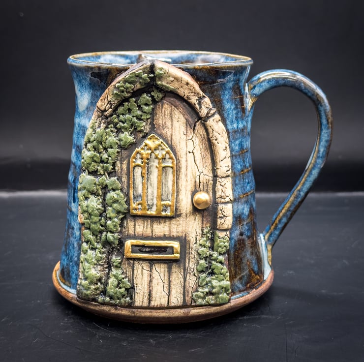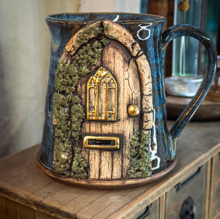 This is part of my cottaegecore mug series. Handmade on the wheel, I've made this one to look like it has a wooden oak door with vines crawling up the side and along the top. I've also added a window to the back of the mug. Each one of these mugs is different, all made by hand and part of the same series, but all are unique. The mug is approximately 12 cm tall and 11cm wide.