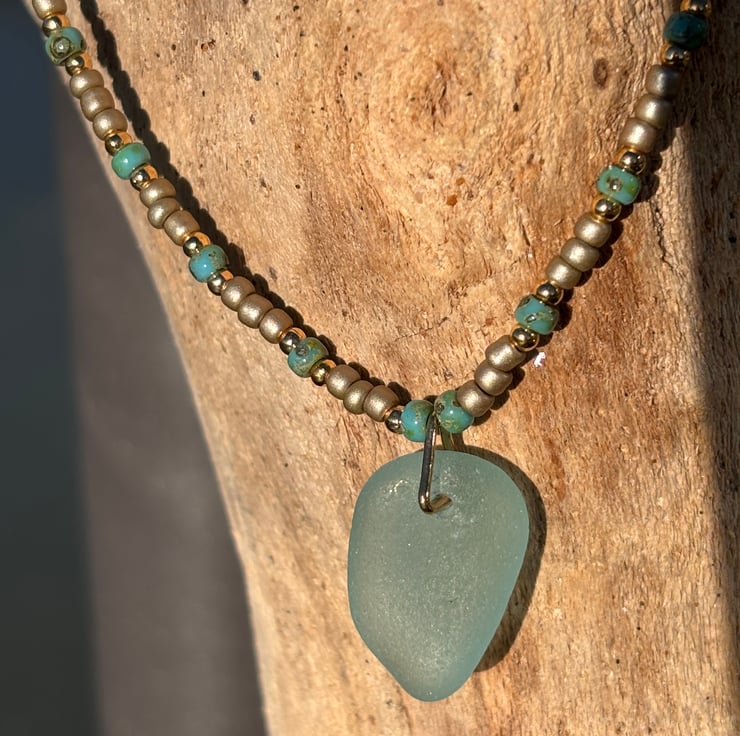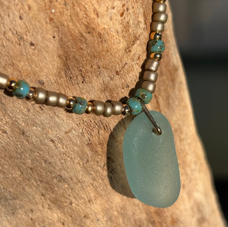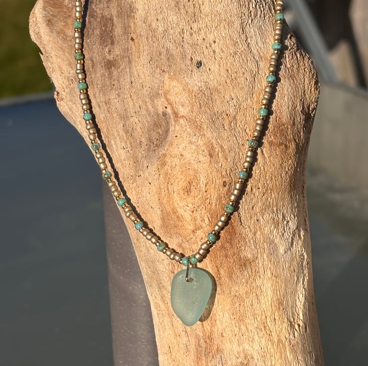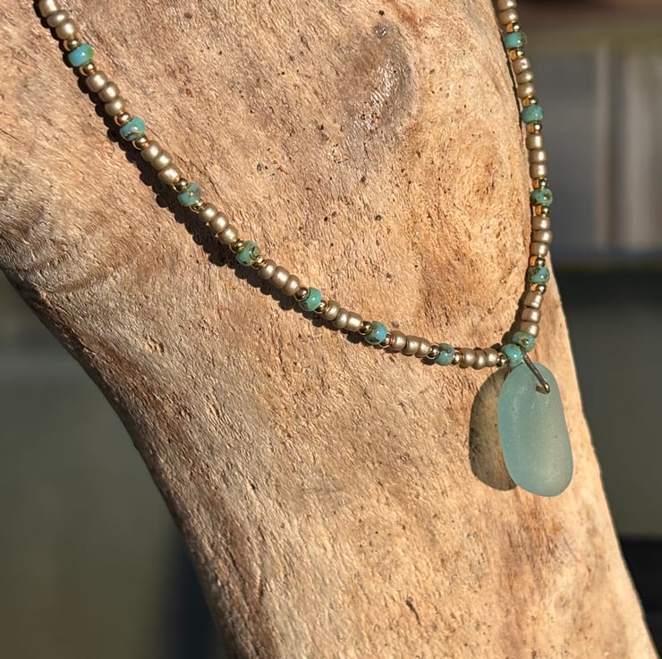 Delicate sand coloured seed beads, Miyuki turquoise colour marbled accent beads and small round gold plated beads. Gold plated clasp and fixings. Tiny seaglass pendant on fine gold plated triangle. Seaglass is approx 1cm wide x 2cm long. Length 36.5cm extending to 42cm approximately. A perfect choice to team up with other necklaces or wear on its own.