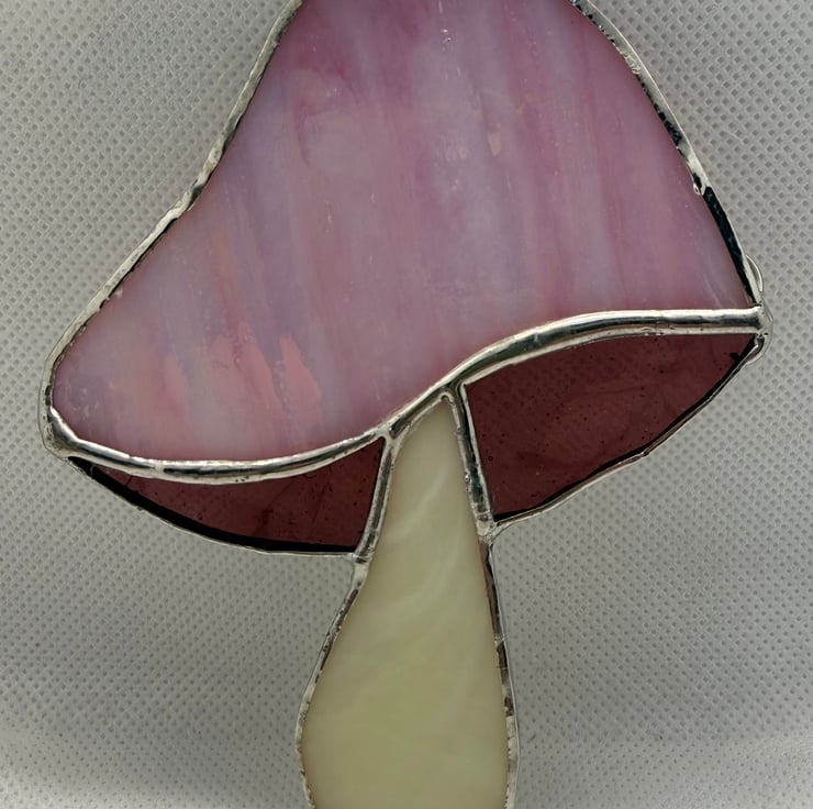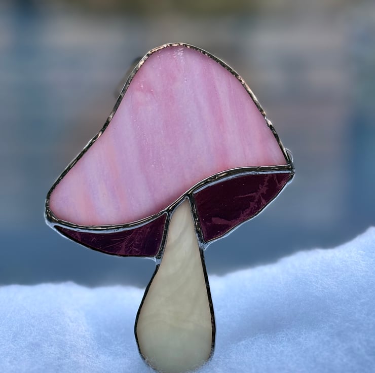 This listing is for one stained glass mushroom, made with an opaque iridescent streaky pink glass for the cap and a deep maroon gluechip glass beneath to suggest the delicate gill structure found in real fungi. The soft shimmer of the cap and the frosted, organic patterning of the gluechip glass give the piece a naturally grown, woodland feel. Two hanging loops are secured on the reverse, and the mushroom is best displayed using both for a balanced, secure hang.
